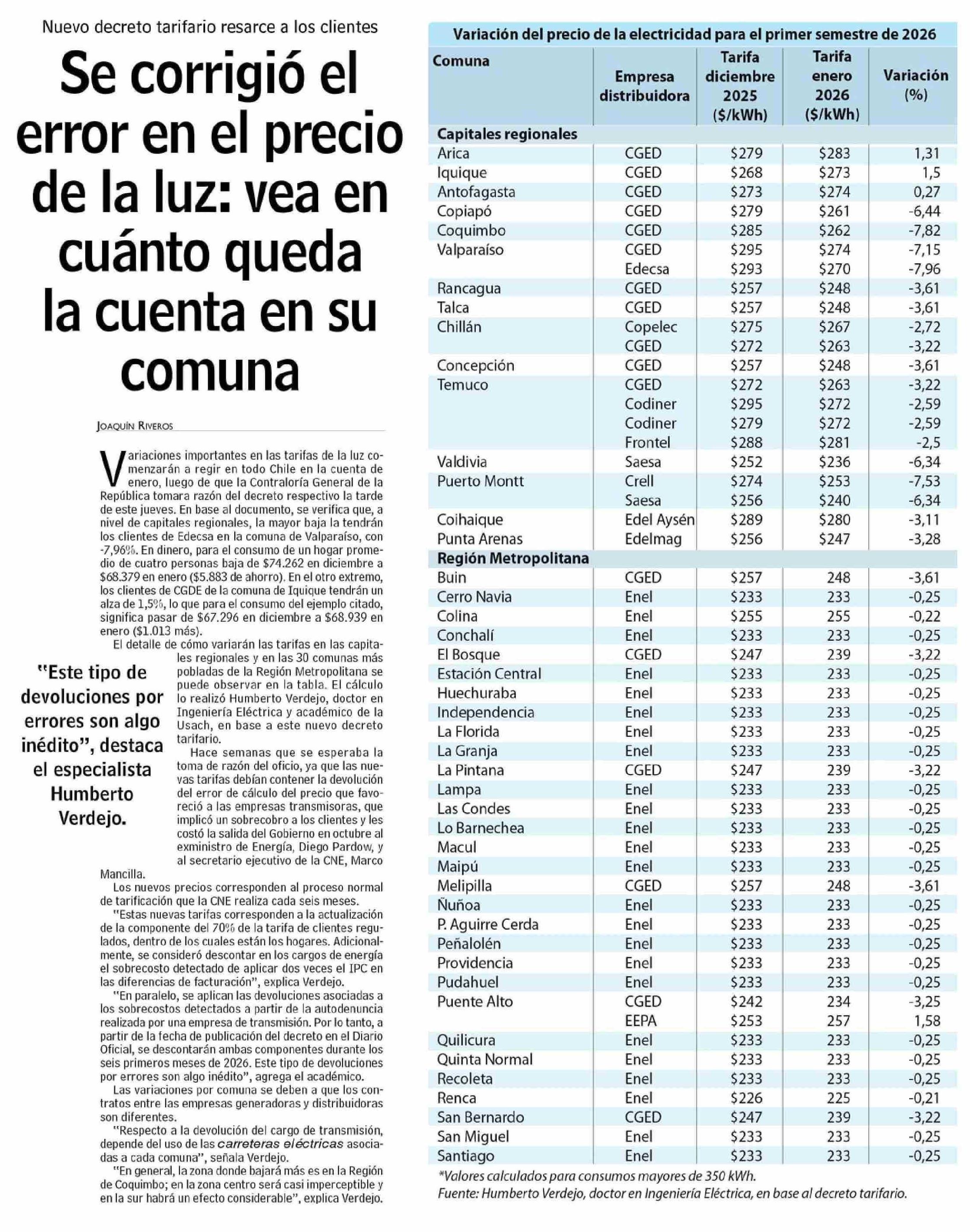 Se corrigió el error en el precio de la luz: vea en cuánto queda la cuenta en su comuna 16-01-2026 Las Últimas Noticias |