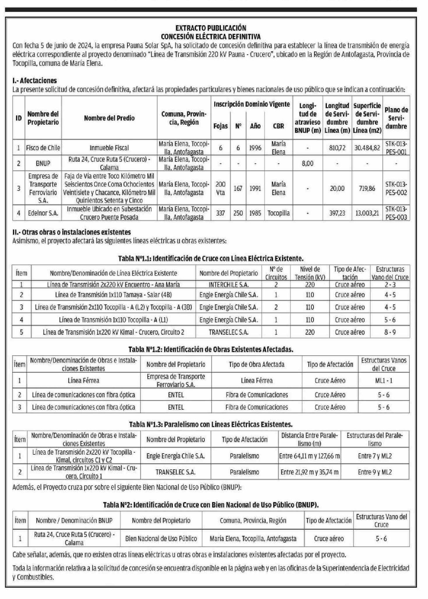 | Título: | Extractos: EXTRACTO PUBLICACIÓN CONCESIÓN ELÉCTRICA DEFINITIVA (Con fecha 5 de junio de 2024, la empresa Pauna Solar Spa, ha solicitado de concesión definitiva para establecer la línea de transmisión de energía eléctrica correspondiente al proyecto denominado “Línea de Transmisión 220 kV Pauna - Cru |