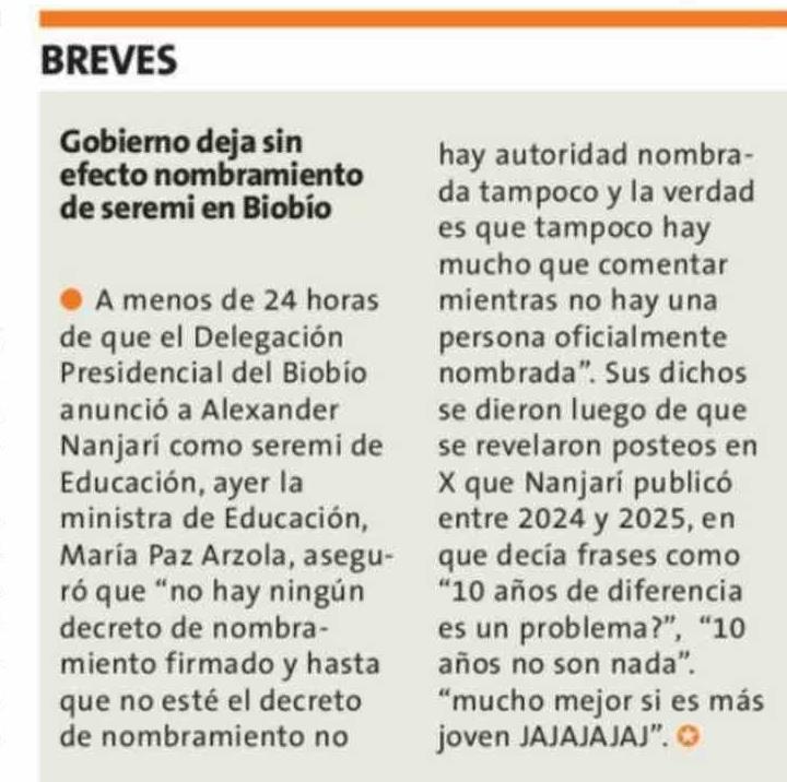 Título: BREVES Gobierno deja sin hay autoridad nombraefecto nombramiento da tampoco y la verdad de seremi en Biobio es que tampoco hay mucho que comentar . A menos de 24 horas mientras no hay una de que el Delegación persona oficialmente Presidencial del Biobío nombrada". Sus dichos anunció a Alexander se d