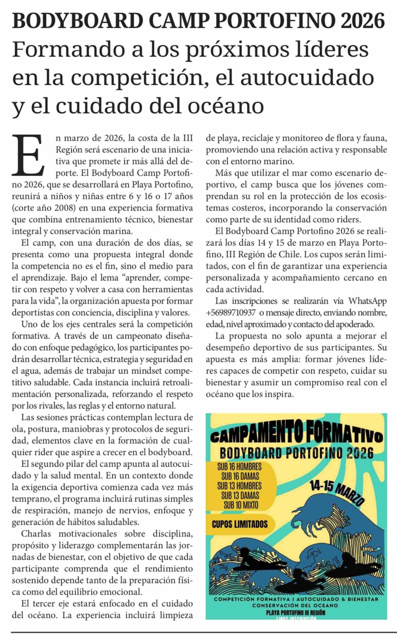 BODYBOARD CAMP PORTOFINO 2026 Formando a los próximos líderes en la competición, el autocuidado y el cuidado del océano 24-02-2026 Diario Chañarcillo |