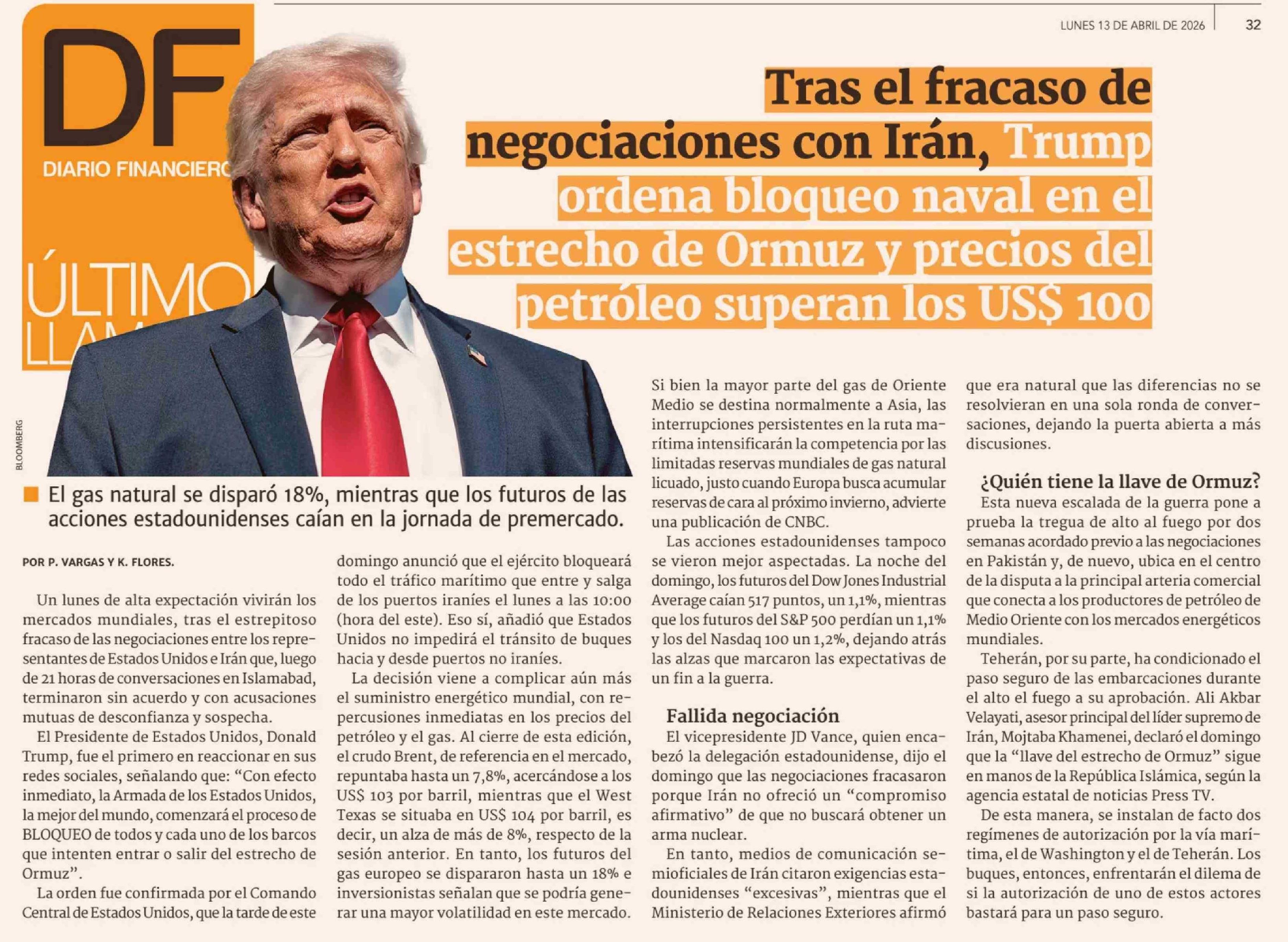 Tras el fracaso de negociaciones con Irán, Trump ordena bloqueo naval en el estrecho de Ormuz y precios del petróleo superan los US$ 100 13-04-2026 Diario Financiero |