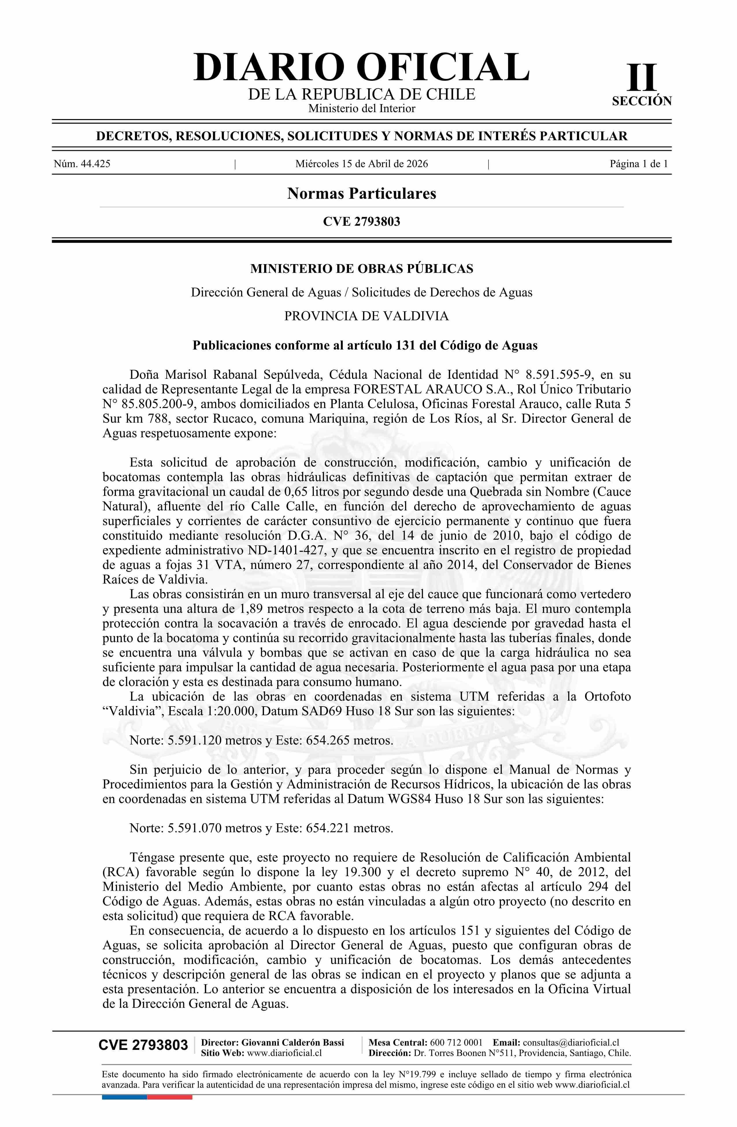 Solicitud Forestal Arauco S.A. 15-04-2026 Diario Oficial Edición Electrónica |