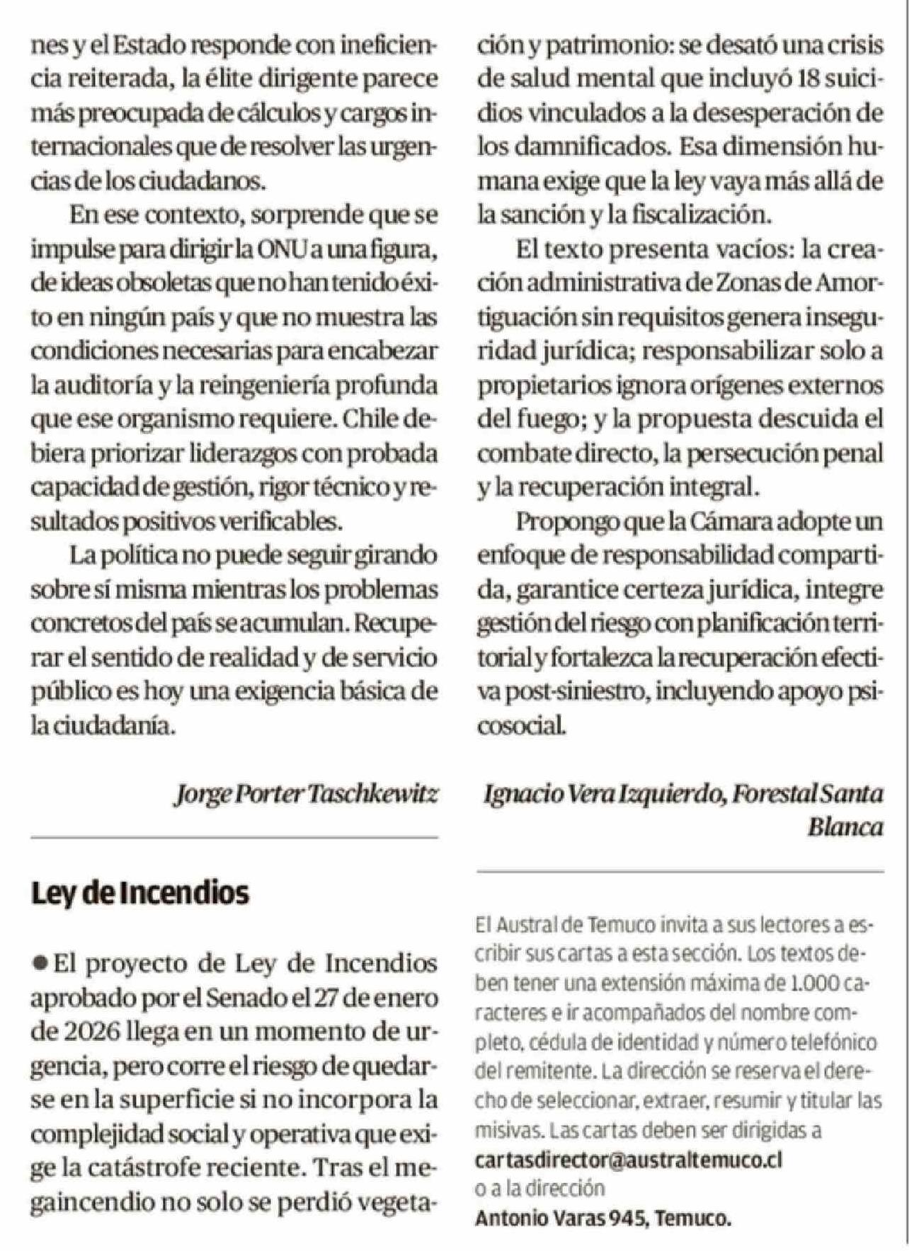 Cartas: Ley de Incendios 09-02-2026 El Austral de la Araucanía |
