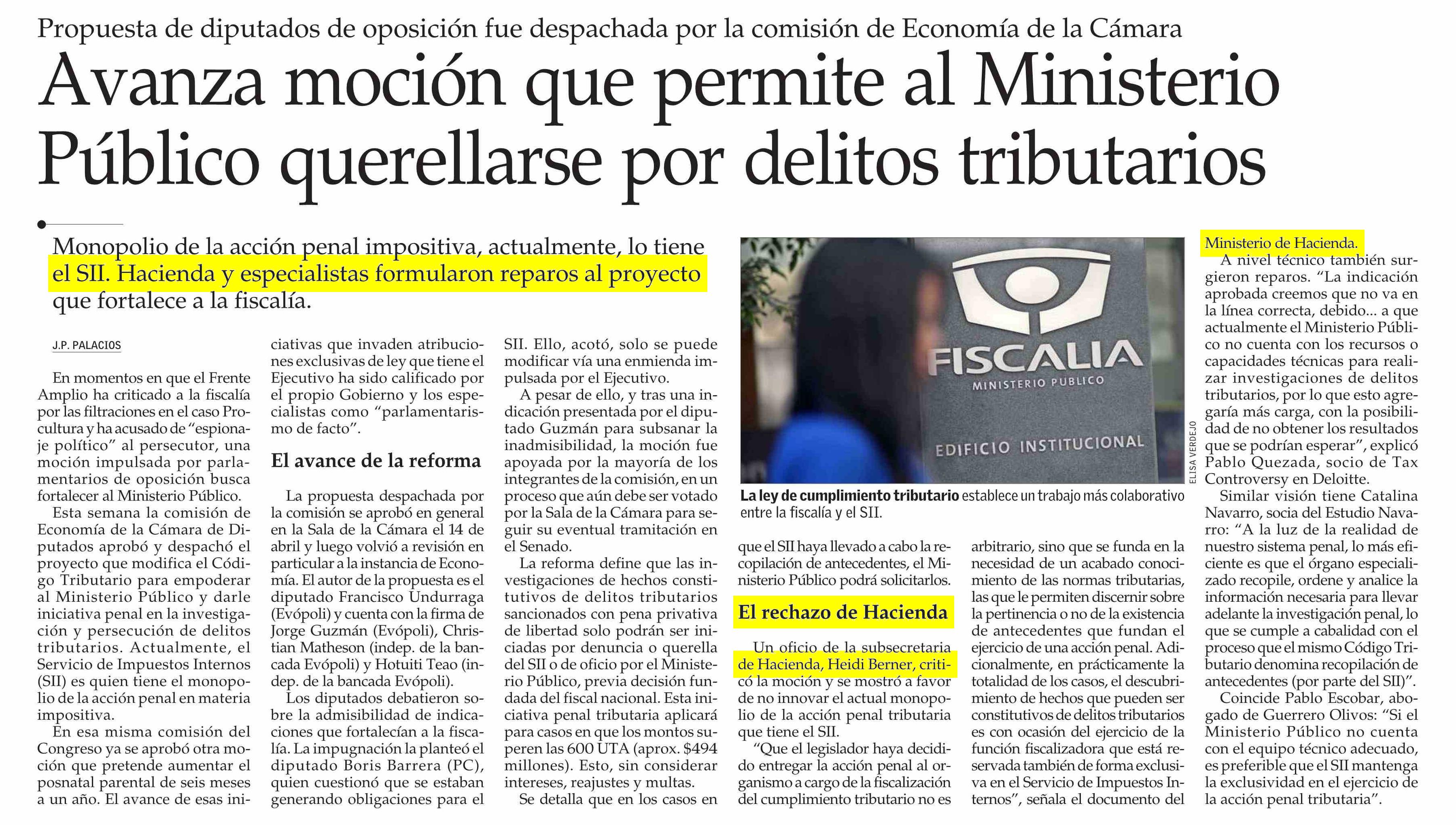 Avanza moción que permite al Ministerio Público querellarse por delitos tributarios 16-05-2025 El Mercurio |