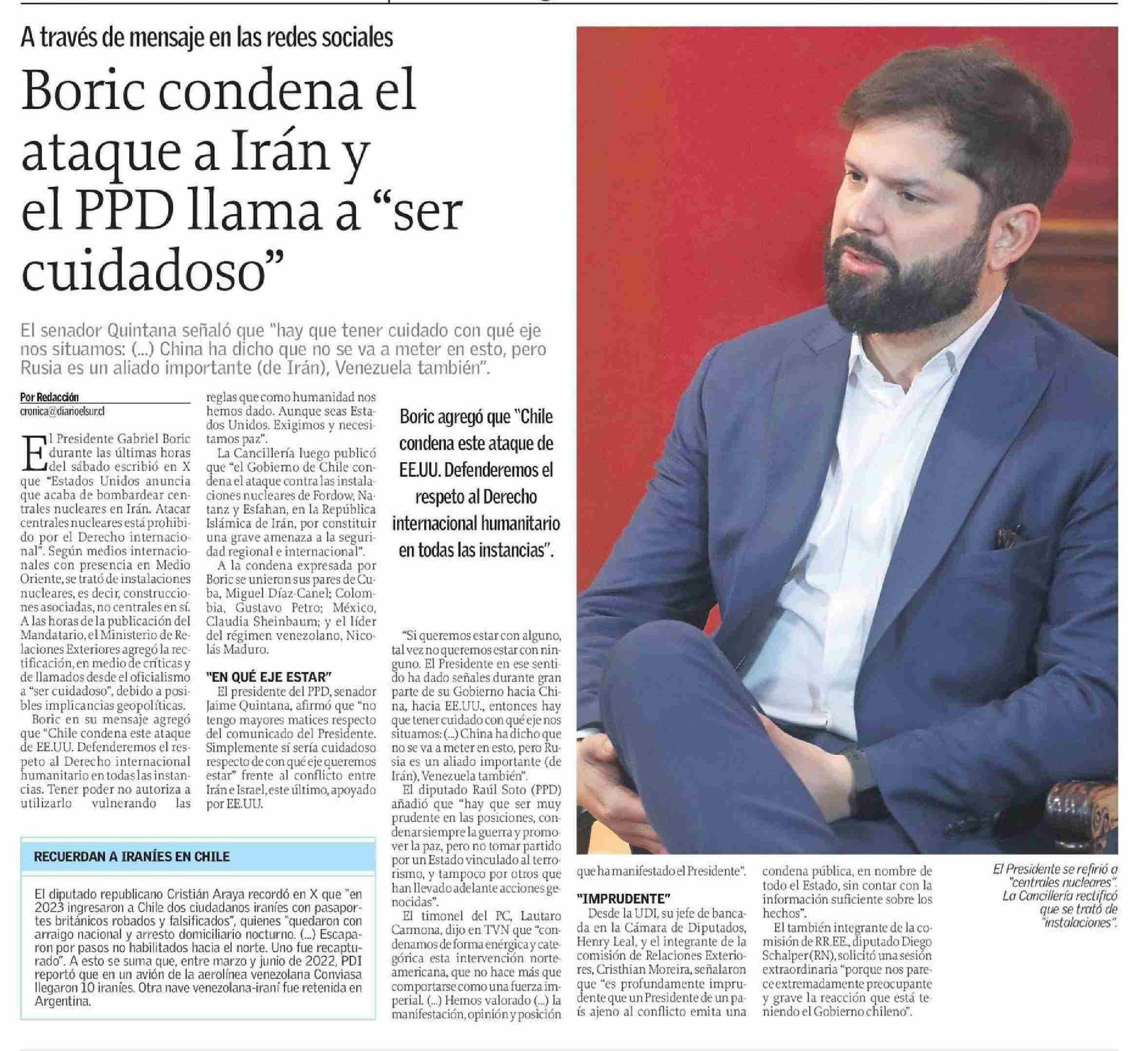 | Título: | Boric condena el ataque a Irán y el PPD llama a “ser cuidadoso” |