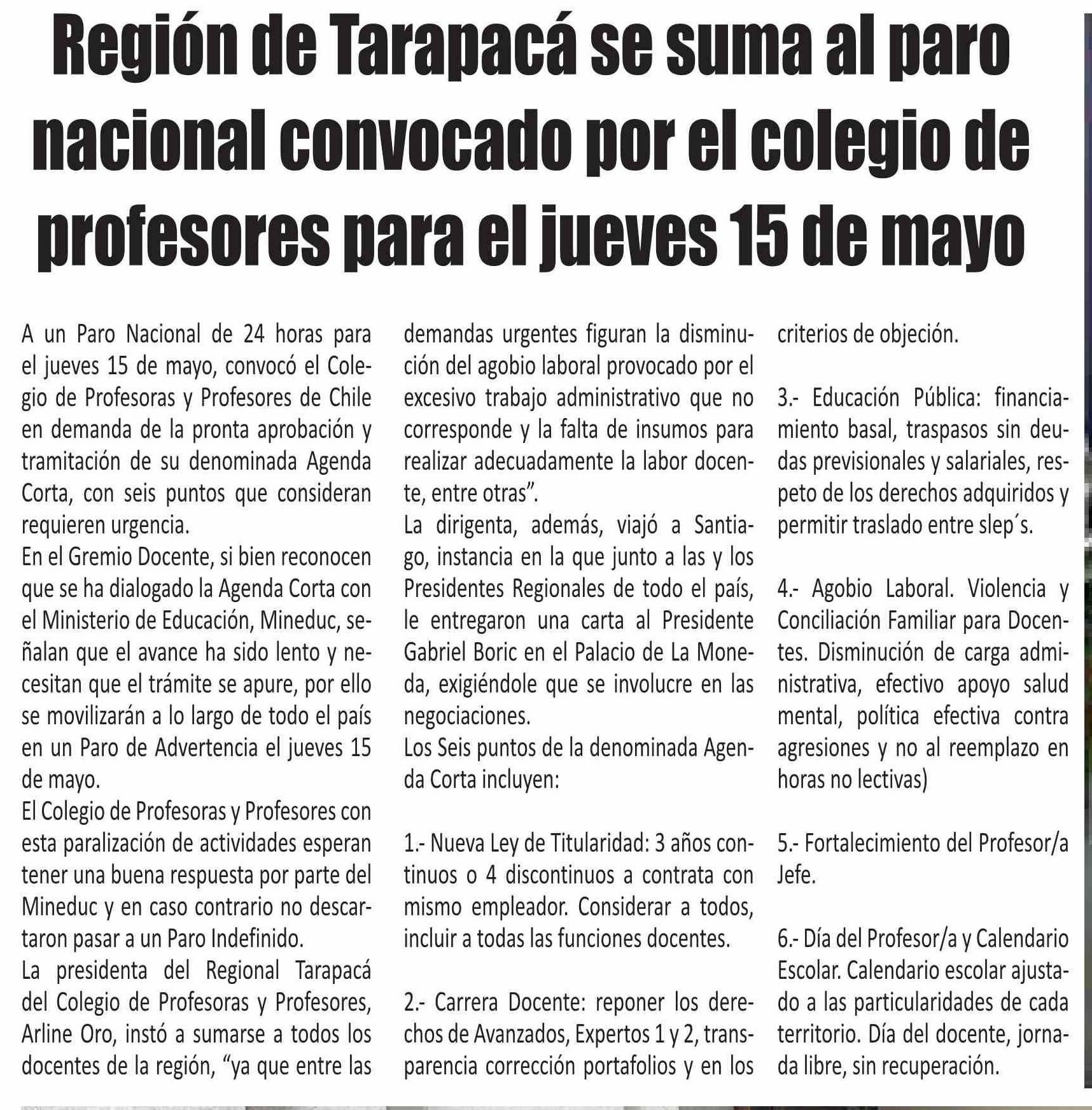 | Título: | Región de Tarapacá se suma al paro nacional convocado por el colegio de profesores para el jueves 15 de mayo |
