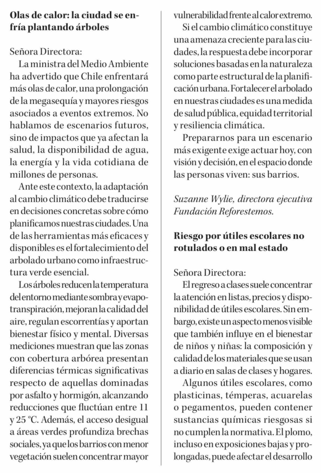 Cartas: Olas de calor: la ciudad se enfría plantando árboles 16-02-2026 Diario Concepción |