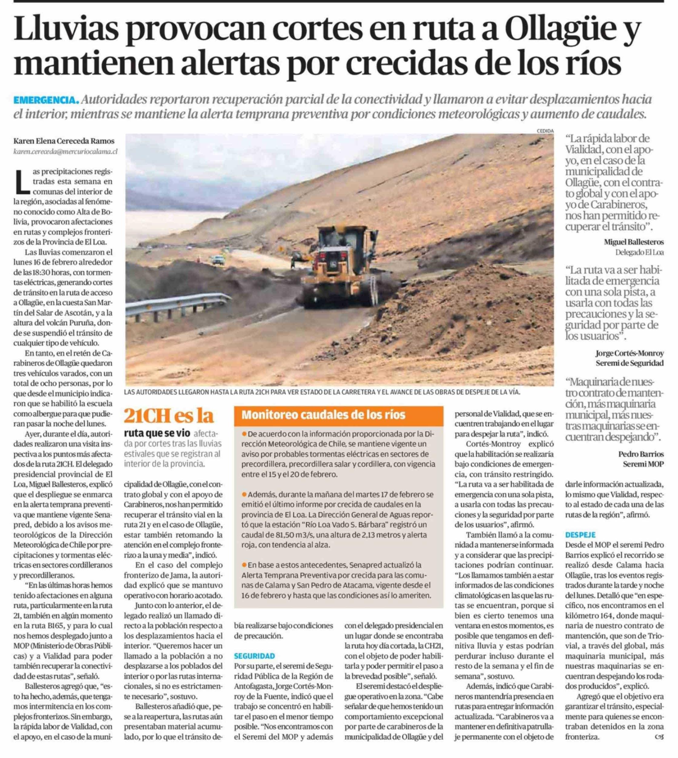 Lluvias provocan cortes en ruta a Ollagüe y mantienen alertas por crecidas de los ríos 18-02-2026 El Mercurio de Calama |