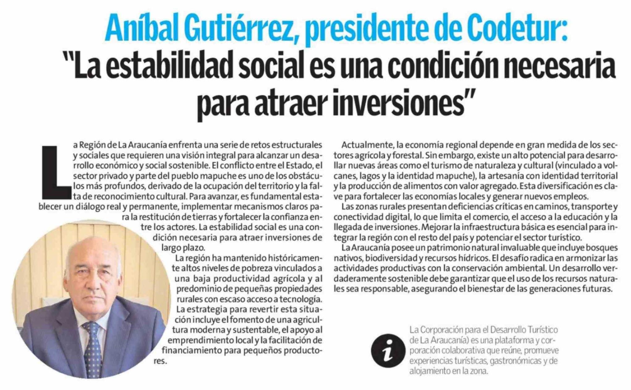 Título: Columnas de Opinión: Aníbal Gutiérrez, presidente de Codetur: "La estabilidad social es una condición necesaria para atraer inversiones"