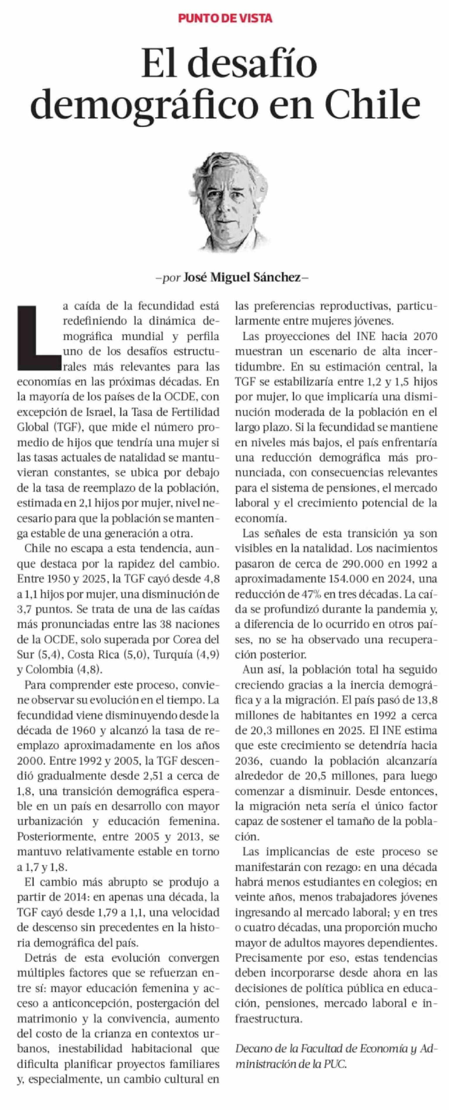 Columnas de Opinión: El desafío demográfico en Chile 10-03-2026 La Tercera |