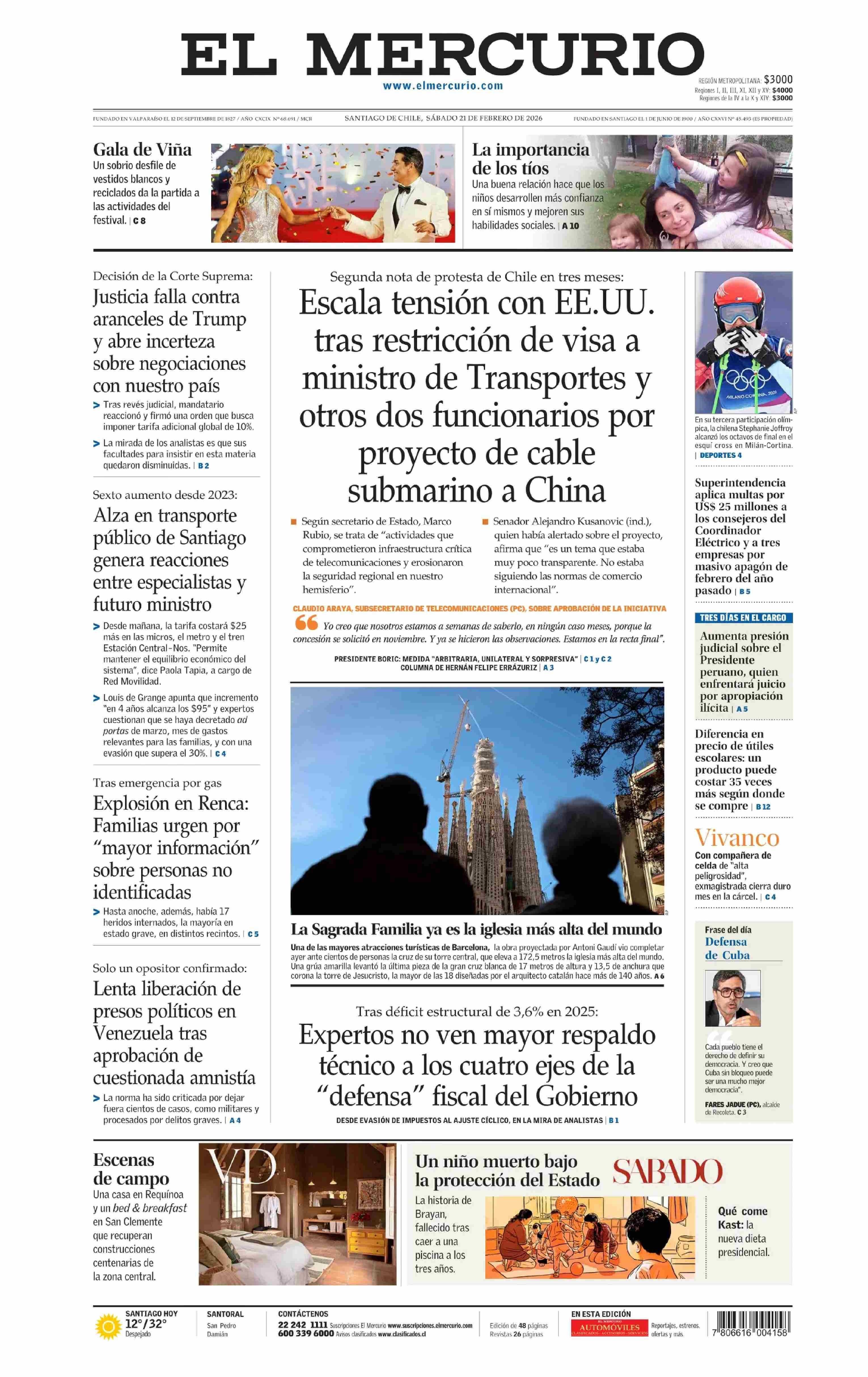PORTADA EL MERCURIO (A SEGUNDA EDICIÓN) - CHILE 21-02-2026 El Mercurio |