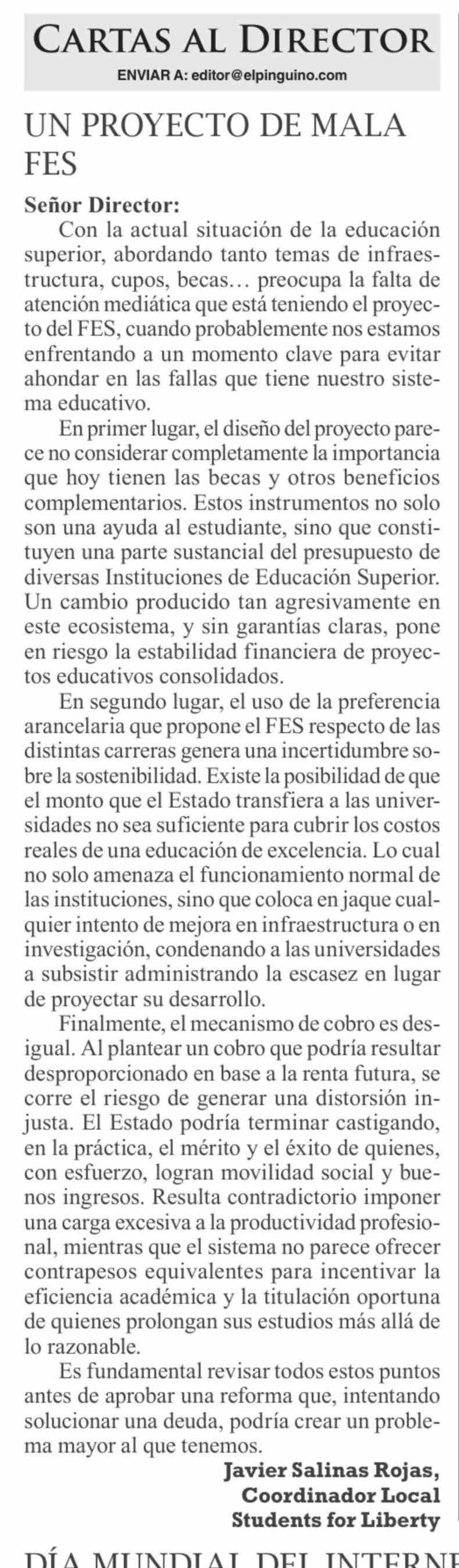 Cartas: UN PROYECTO DE MALA FES 10-02-2026 El Pingüino |