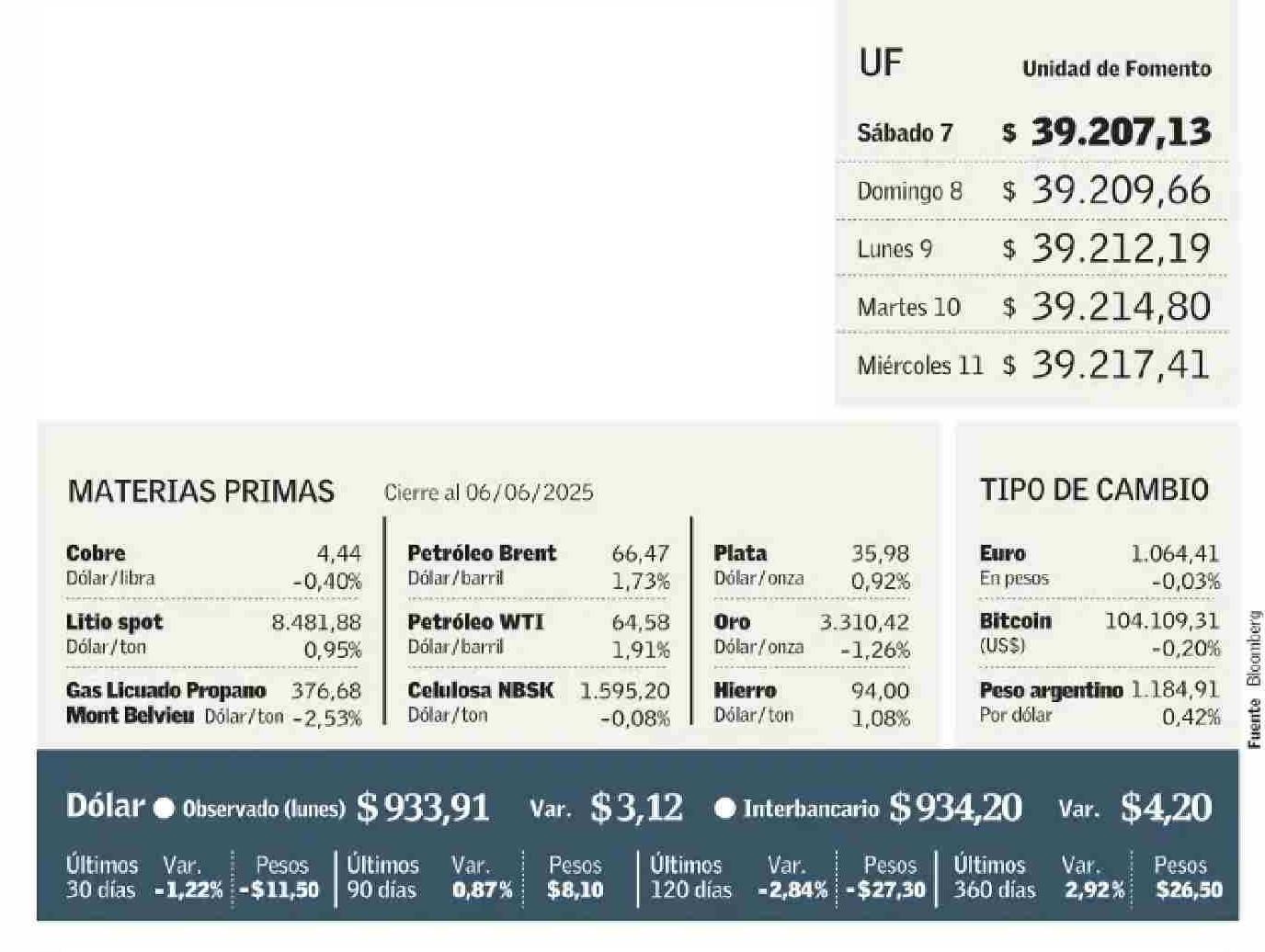 INDICADORES ECONÓMICOS: UF -MATERIAS PRIMAS - TIPO DE CAMBIO - DÓLAR 07-06-2025 El Mercurio |