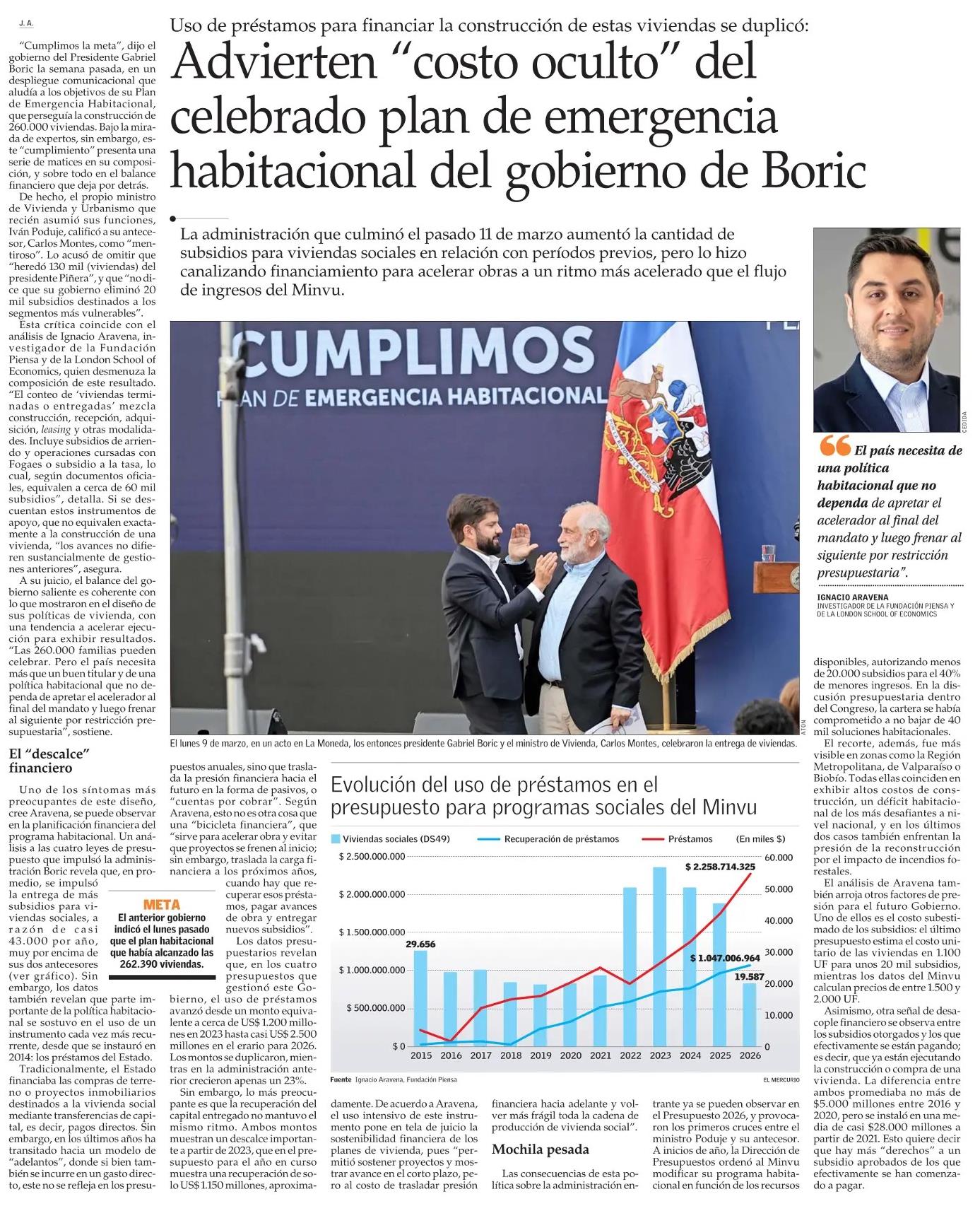 Advierten “costo oculto” del celebrado plan de emergencia habitacional del gobierno de Boric 16-03-2026 El Mercurio |
