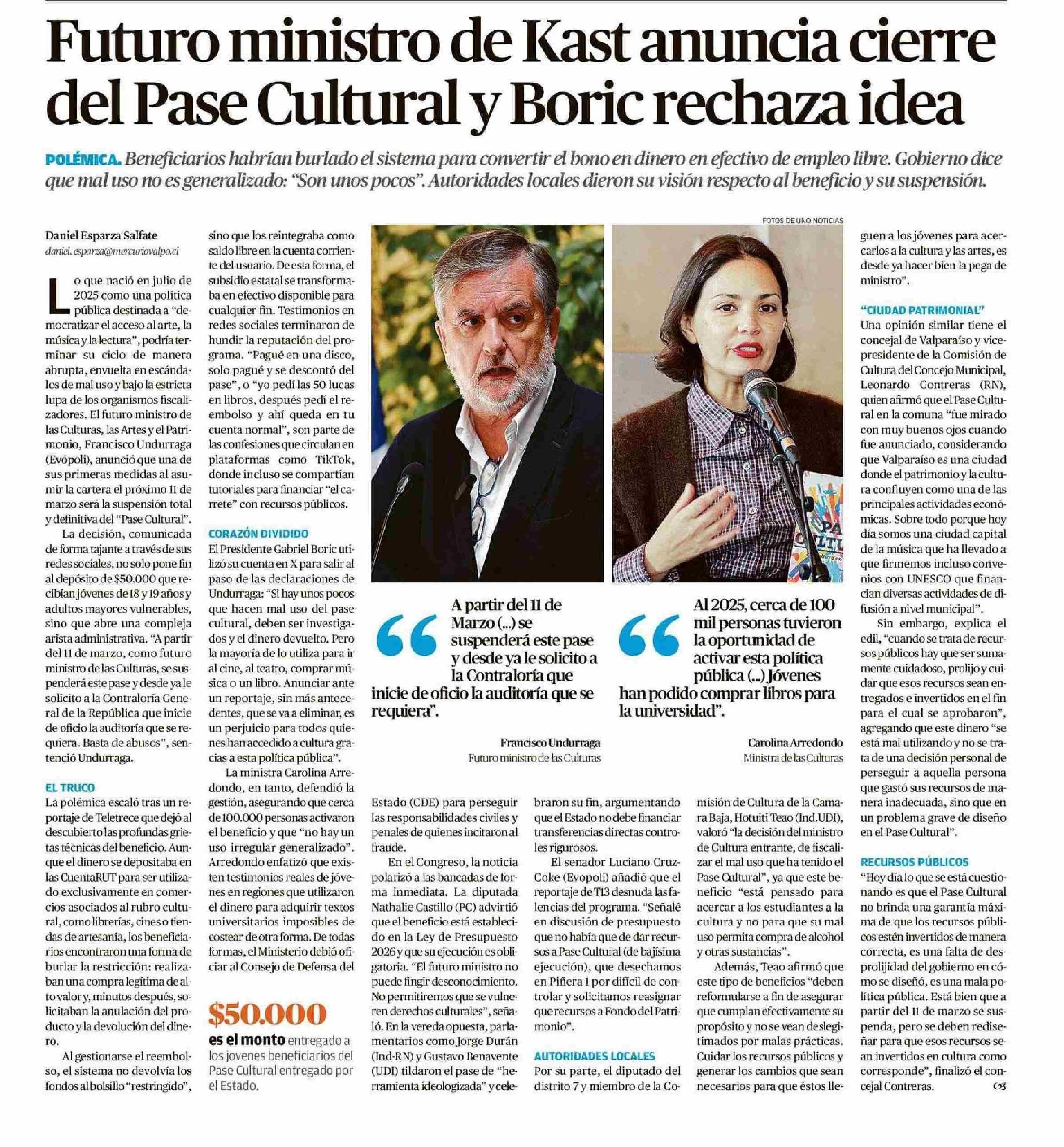 Título: Futuro ministro de Kast anuncia cierre del Pase Cultural y Boric rechaza idea
