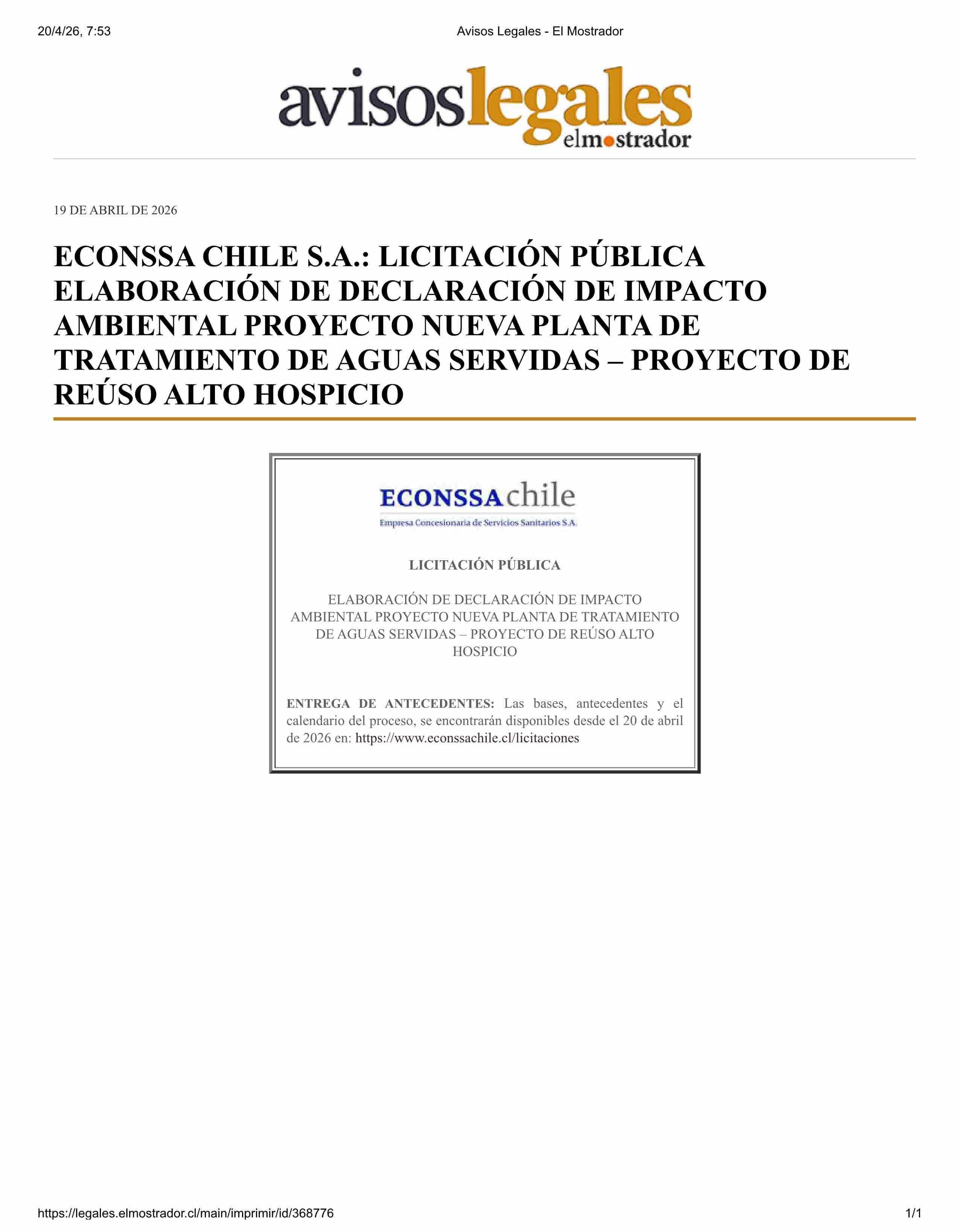 Título: AVISO LICITACIONES: ECONSSA CHILE S.A. LICITACIÓN PÚBLICA ELABORACIÓN DE DECLARACIÓN DE IMPACTO AMBIENTAL PROYECTO NUEVA PLANTA DE TRATAMIENTO DE AGUAS SERVIDAS - PROYECTO DE REÚSO ALTO HOSPICIO