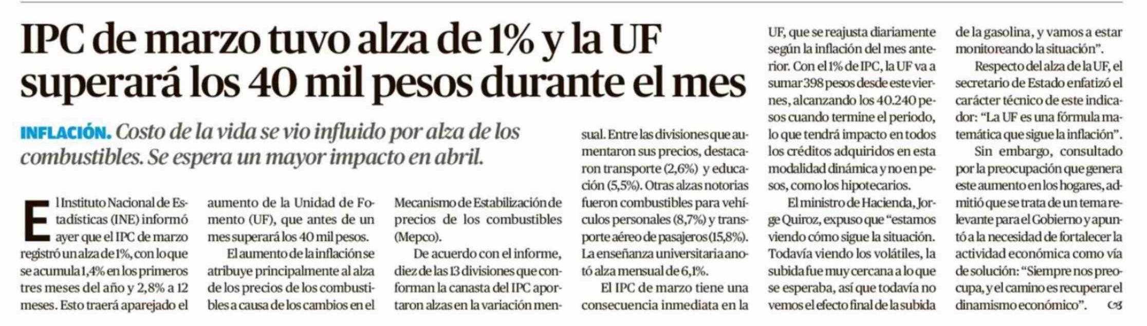 | Título: | IPC de marzo tuvo alza de 1% y la UF superará los 40 mil pesos durante el mes |