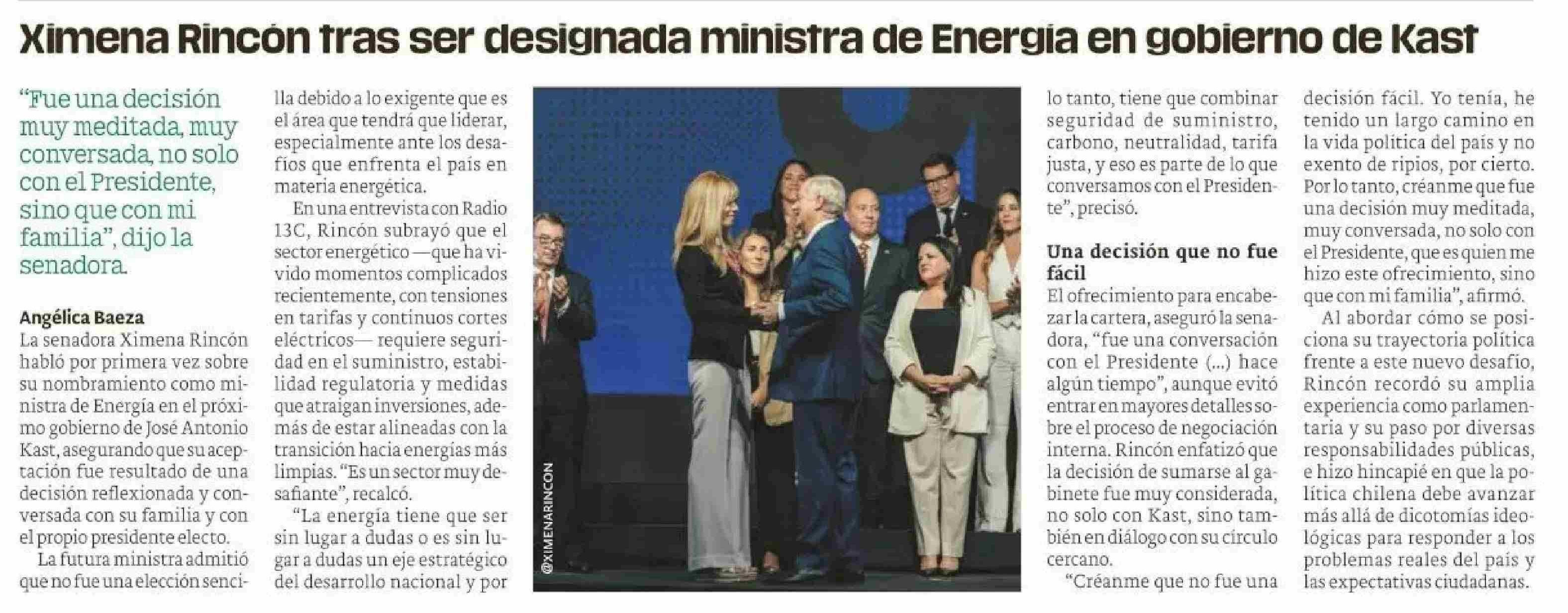 Ximena Rincon tras ser designada ministra de Energia en gobierno de Kast 22-01-2026 Publimetro |