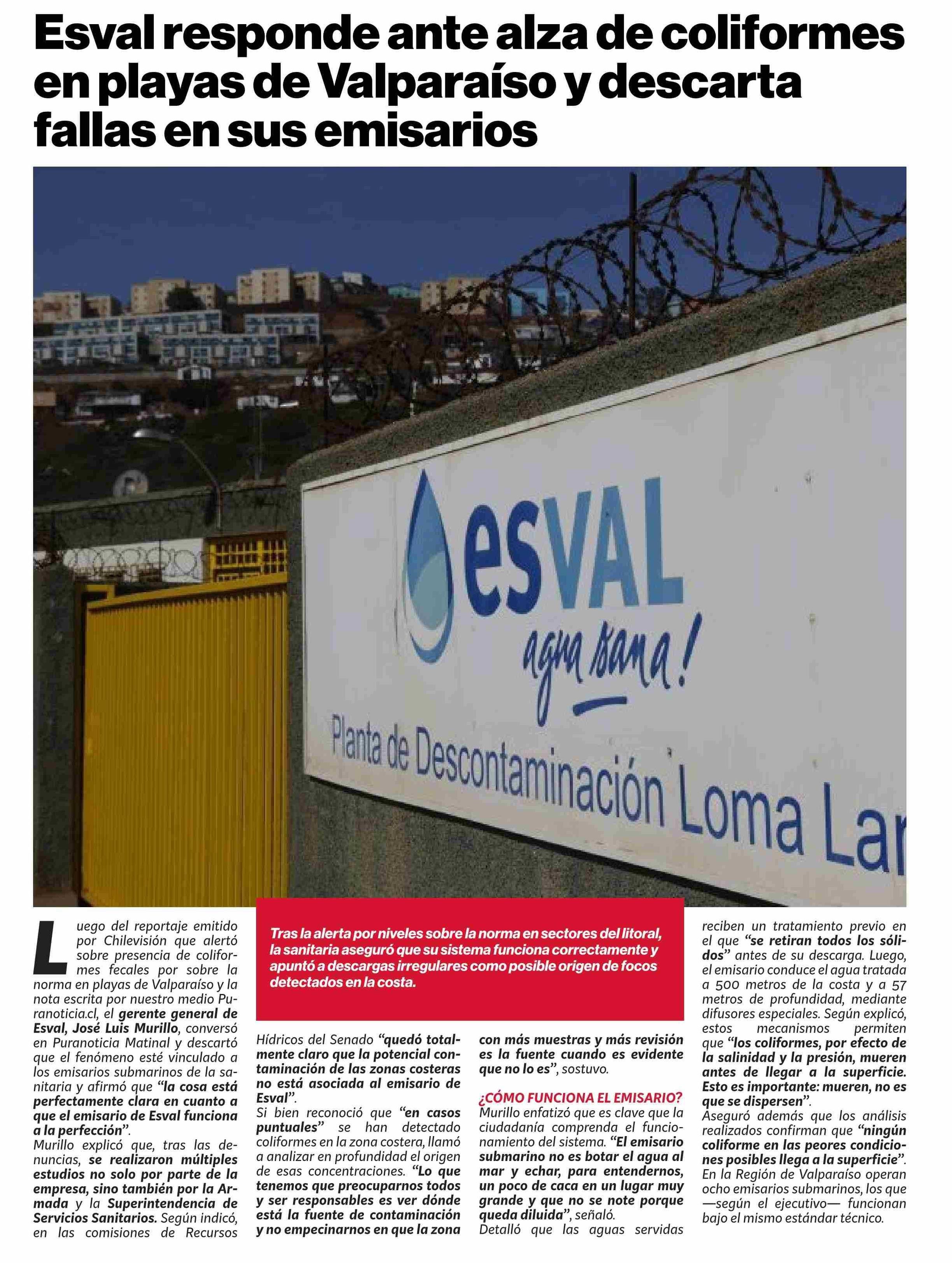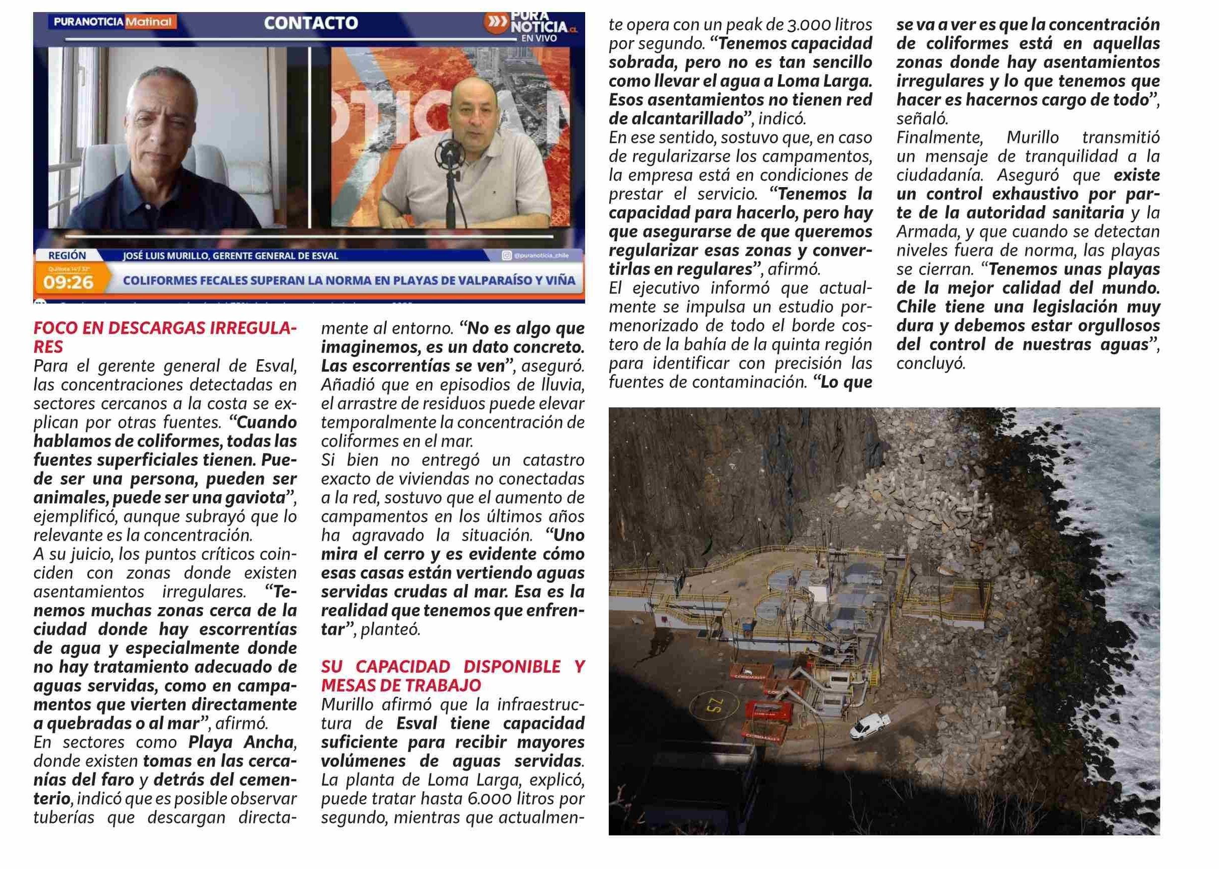 Esval responde ante alza de coliformes en playas de Valparaíso y descarta fallas en sus emisarios 12-02-2026 Puranoticia.cl |