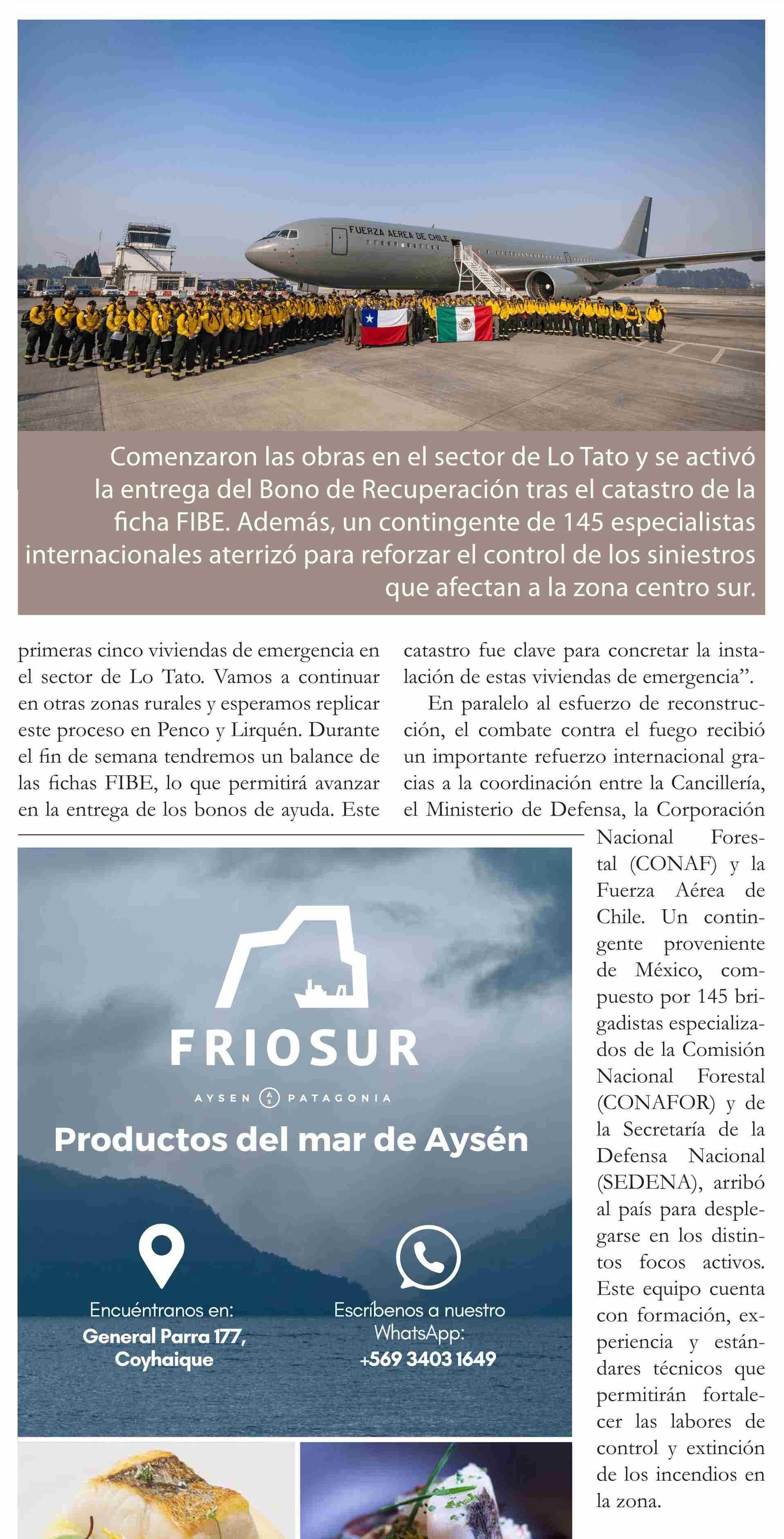 | Título: | Comenzaron las obras en el sector de Lo Tato y se activó la entrega del Bono de Recuperación tras el catastro de la ficha FIBE. Además, un contingente de 145 especialistas internacionales aterrizó para reforzar el control de los siniestros que afectan a la zona centro sur. |