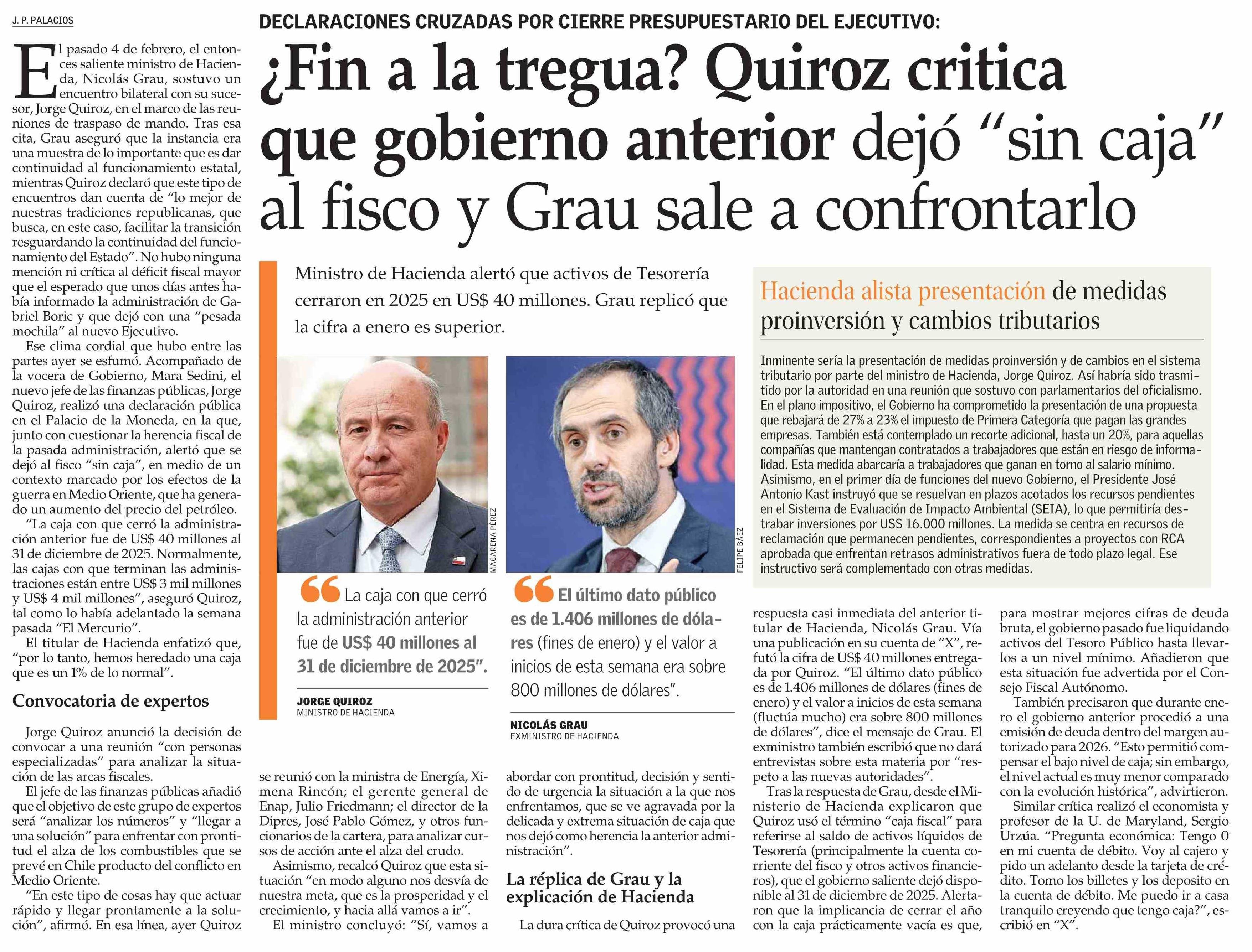 Título: ¿Fin a la tregua? Quiroz critica que gobierno anterior dejó “sin caja” al fisco y Grau sale a confrontarlo