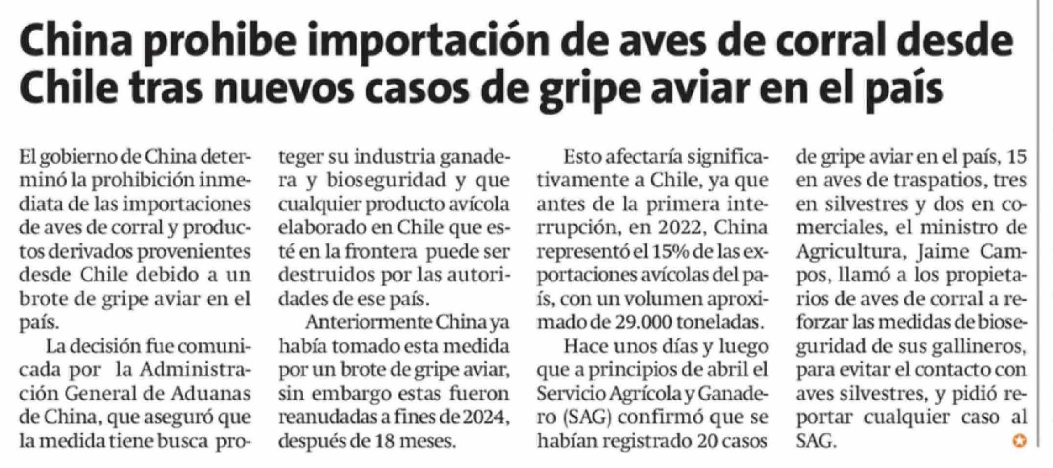 China prohibe importación de aves de corral desde Chile tras nuevos casos de gripe aviar en el país 24-04-2026 La Estrella de Iquique |