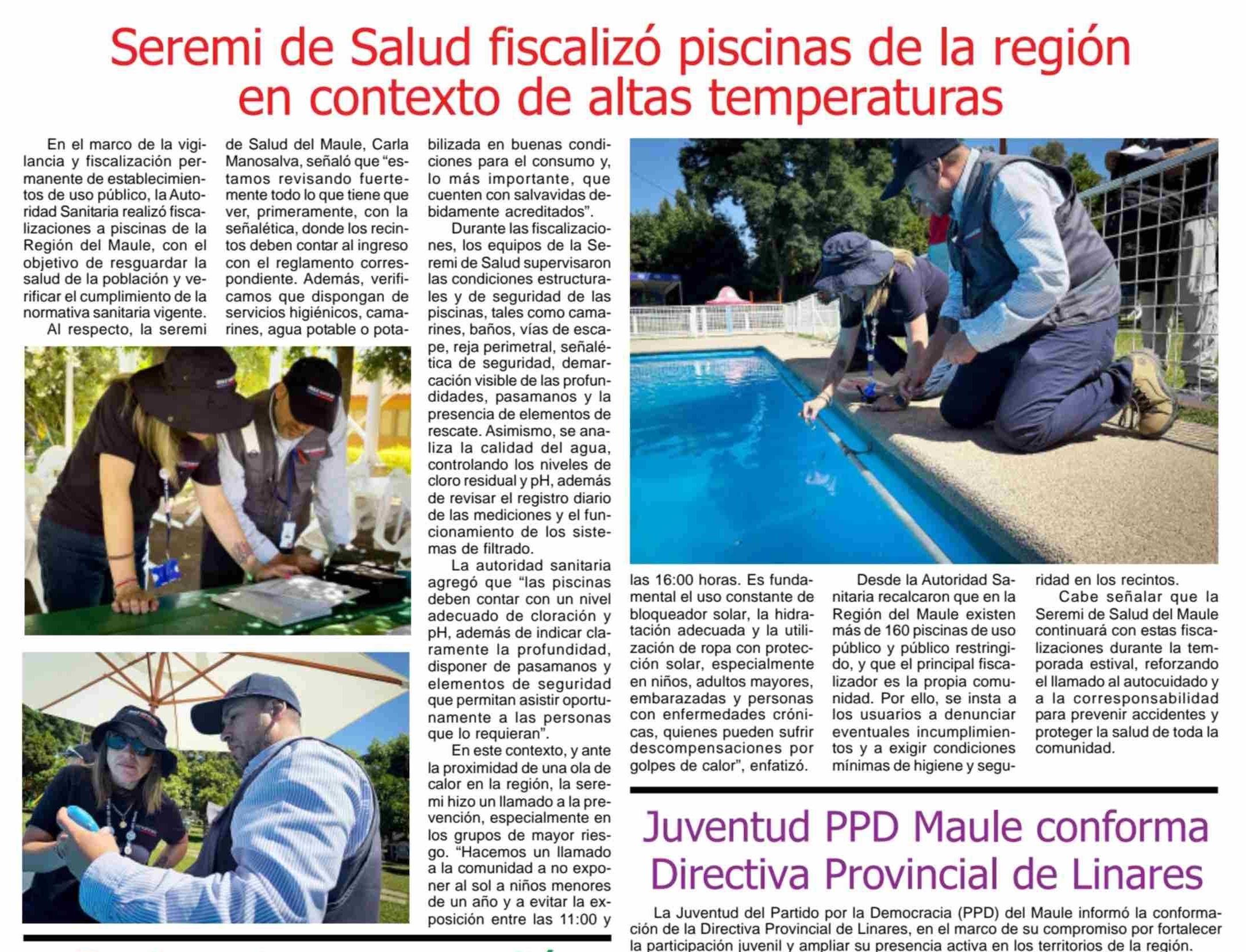 Seremi de Salud fiscalizó piscinas de la región en contexto de altas temperaturas 09-01-2026 Maule Hoy |