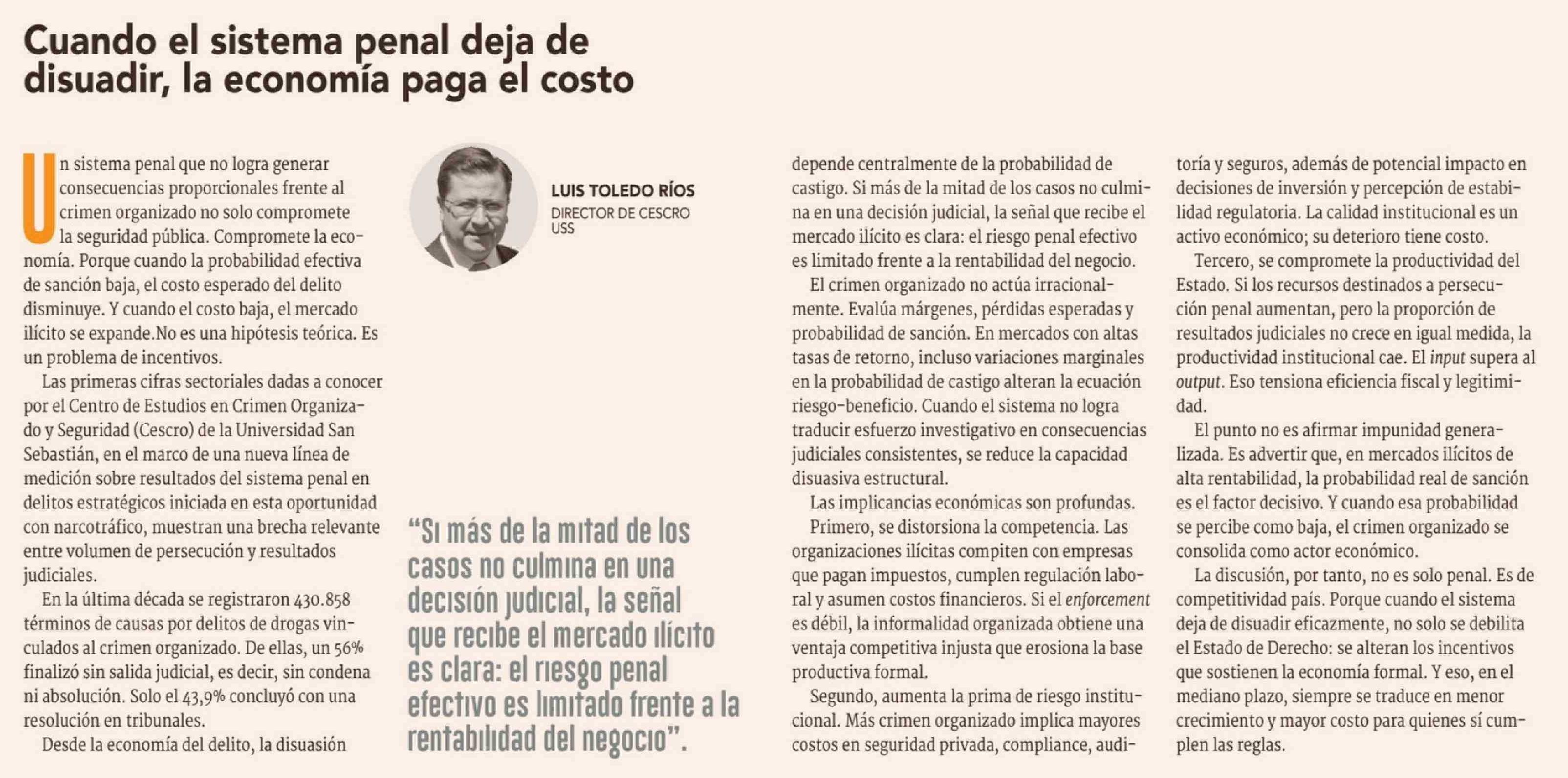 Columnas de Opinión: Cuando el sistema penal deja de disuadir, la economía paga el costo 18-02-2026 Diario Financiero |