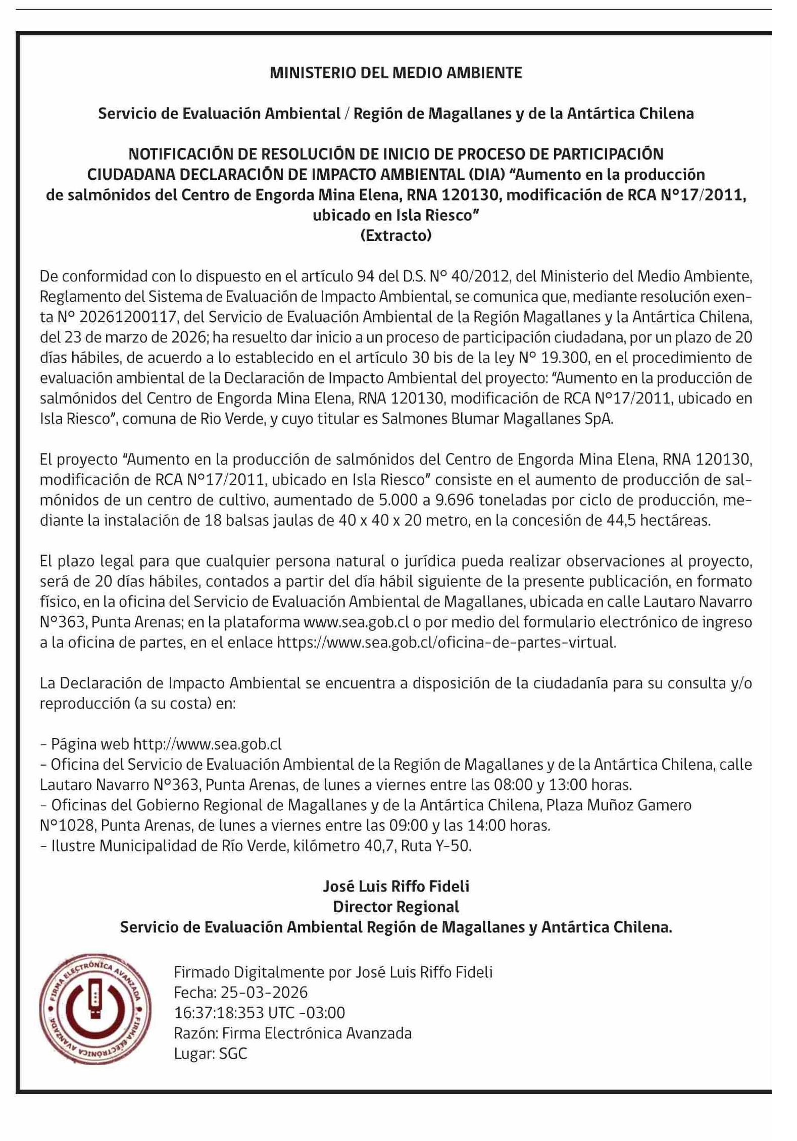 | Título: | EXTRACTOS: NOTIFICACIÓN DE RESOLUCIÓN DE INICIO DE PROCESO DE PARTICIPACIÓN CIUDADANA DECLARACIÓN DE IMPACTO AMBIENTAL (DIA) “Aumento en la producción de salmónidos del Centro de Engorda Mina Elena, RNA 120130, modificación de RCA N%17/2011, ubicado en Isla Riesco” (Extracto) |