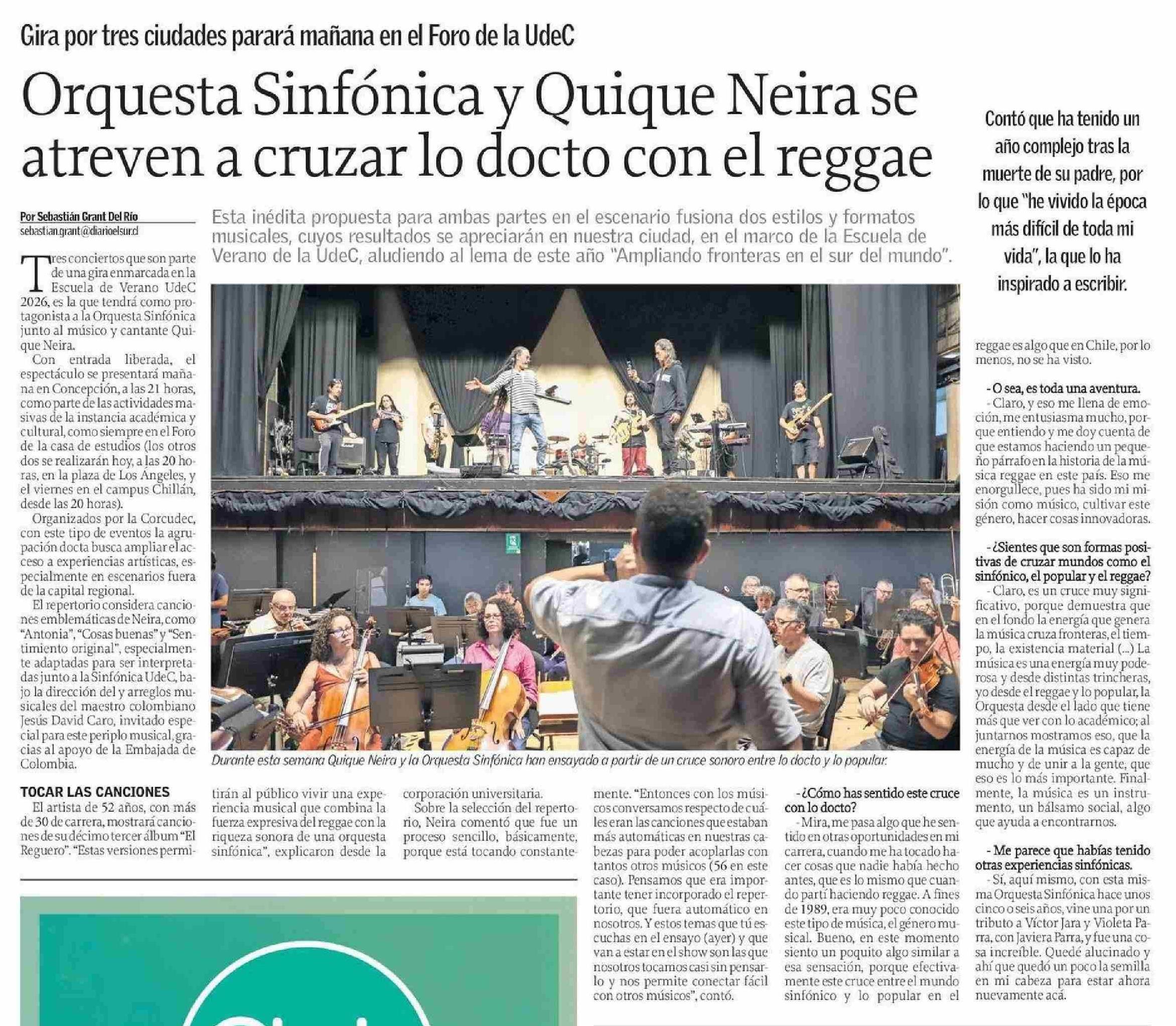 Orquesta Sinfónica y Quique Neira se atreven a cruzar lo docto con el reggae 14-01-2026 El Sur |
