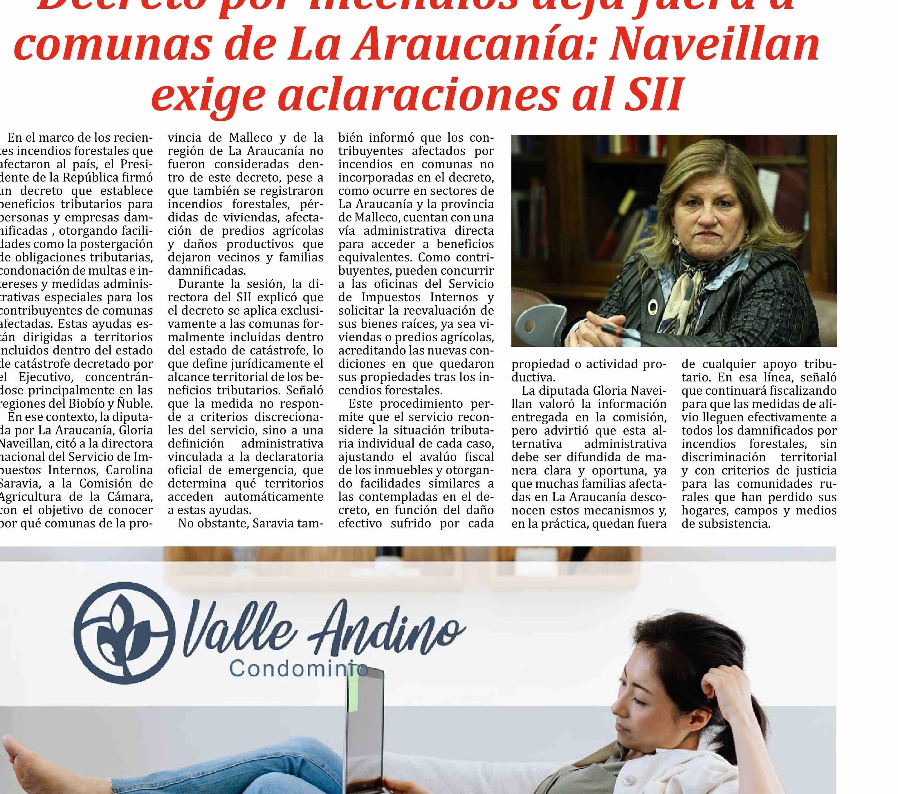 | Título: | Decreto por incendios deja fuera a comunas de La Araucanía: Naveillan exige aclaraciones al SII |