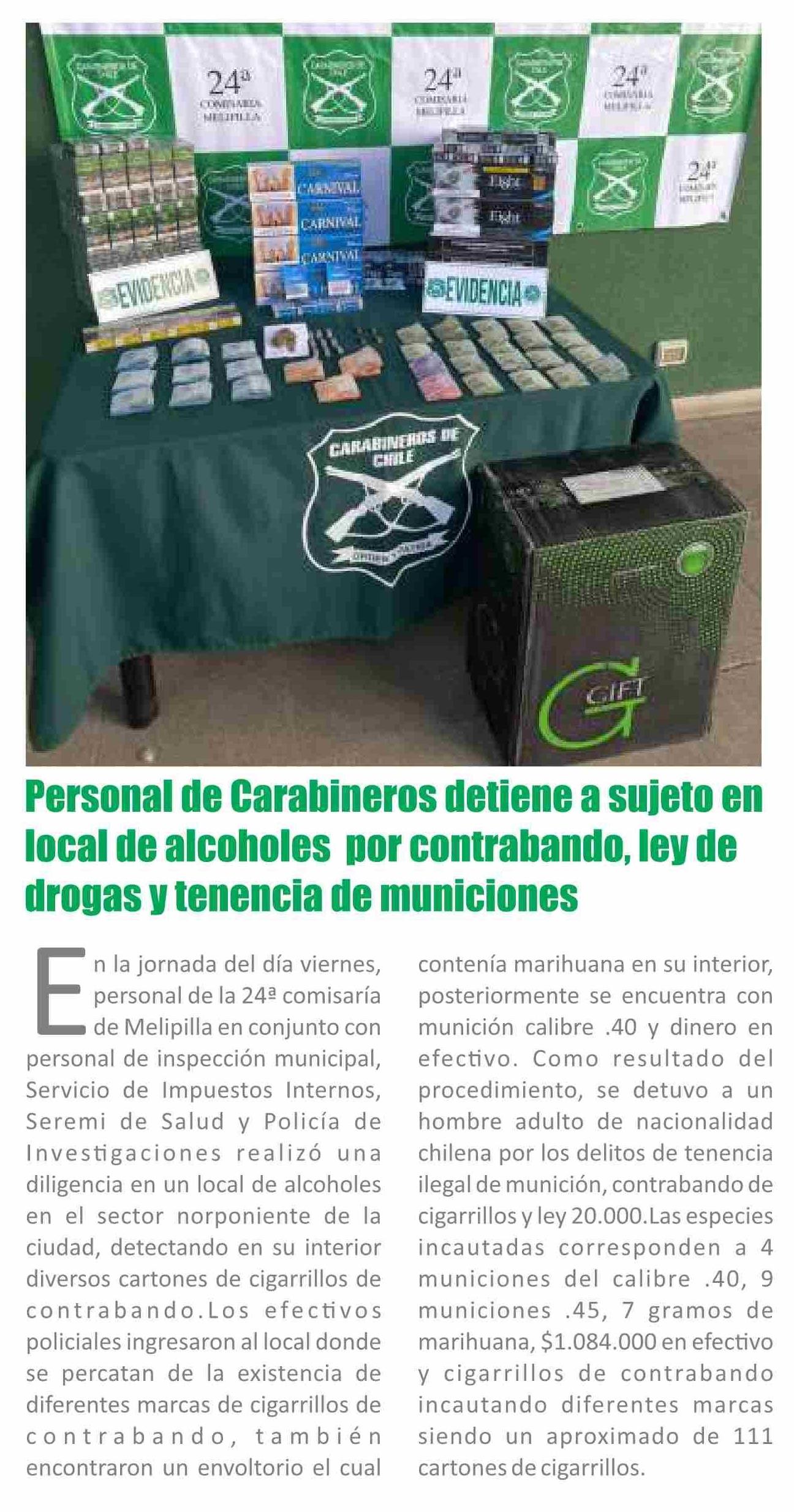 | Título: | Personal de Carabineros detiene a sujeto en local de alcoholes por contrabando, ley de drogas y tenencia de municiones |