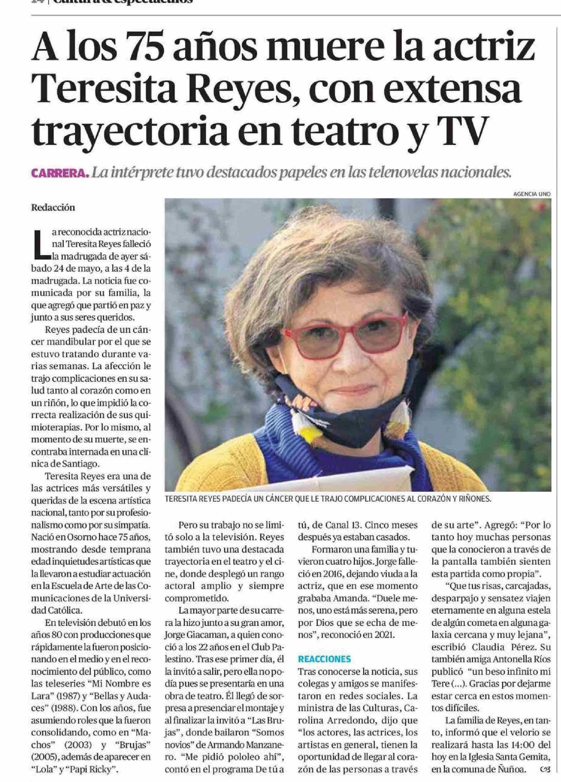 A los 75 años muere la actriz Teresita Reyes, con extensa trayectoria en teatro y TV 25-05-2025 El Mercurio de Calama |