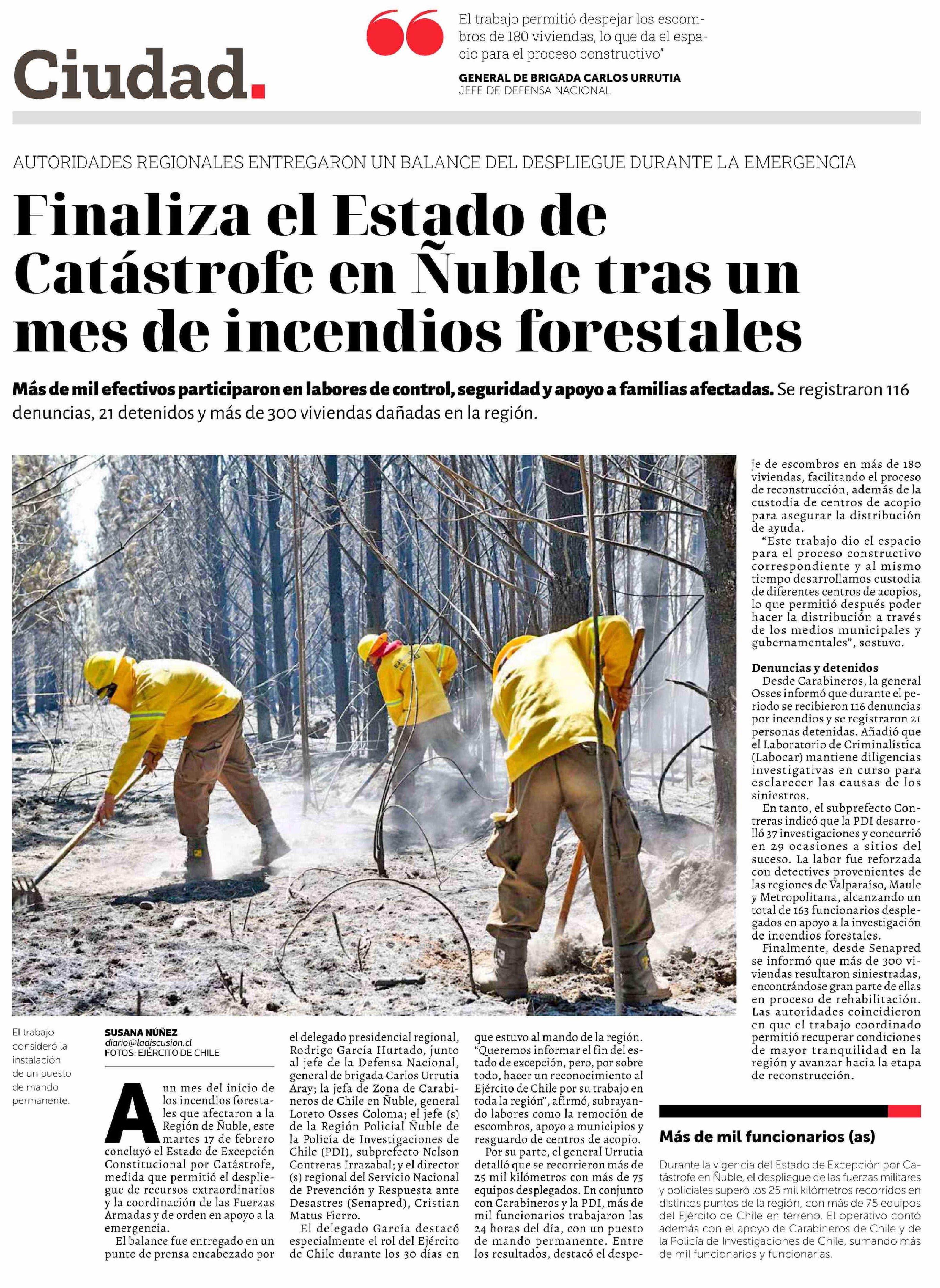 Finaliza el Estado de Catástrofe en Nuble tras un mes de incendios forestales 18-02-2026 La Discusión |