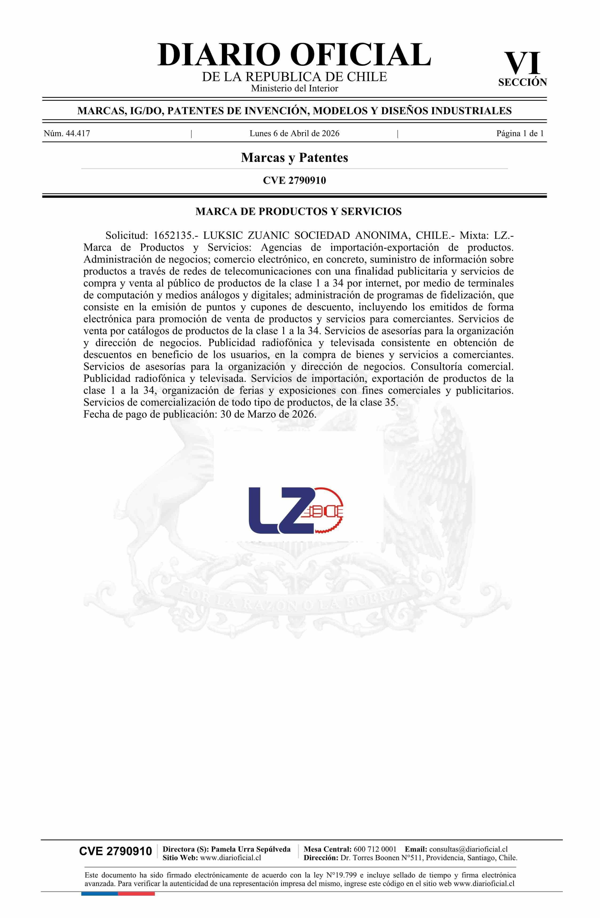 Fuente: Diario Oficial Edición Electrónica (Diario Oficial de Chile - 6 Marcas Y Patentes) Página(s): 74