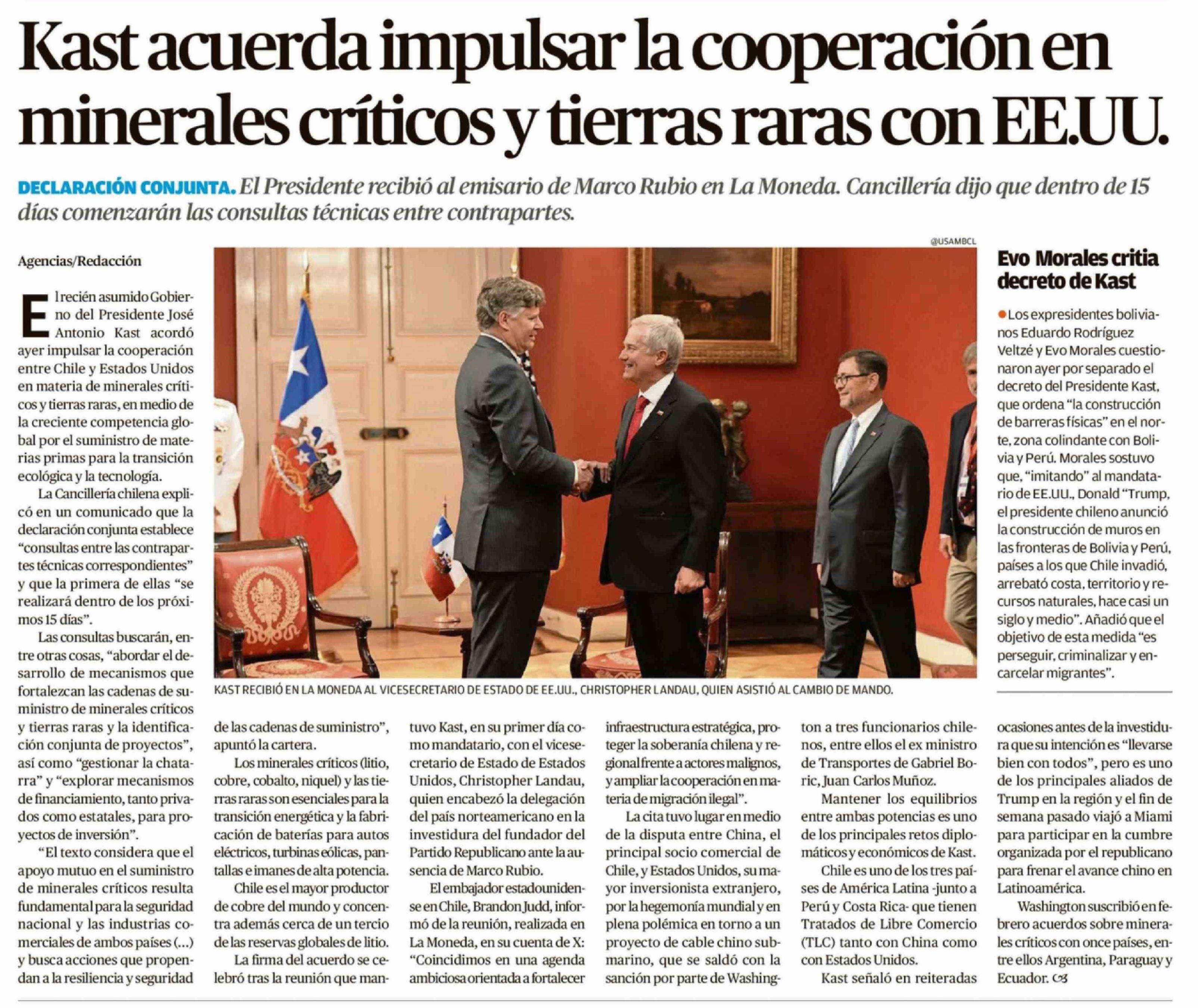| Título: | Kast acuerda impulsar la cooperación en minerales críticos y tierras raras con EE.UU. |