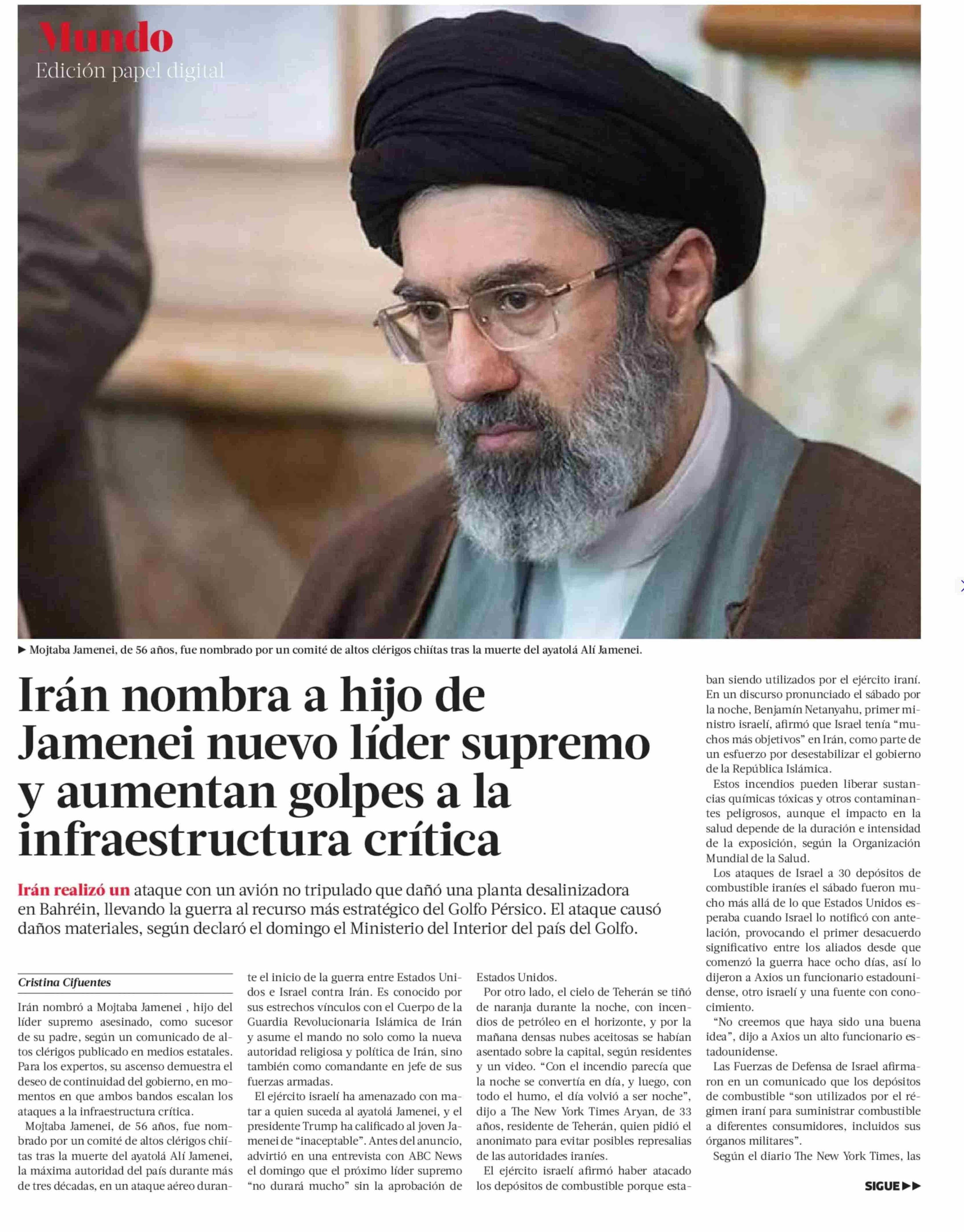 | Título: | Irán nombra a hijo de Jamenei nuevo líder supremo y aumentan golpes a la infraestructura crítica |