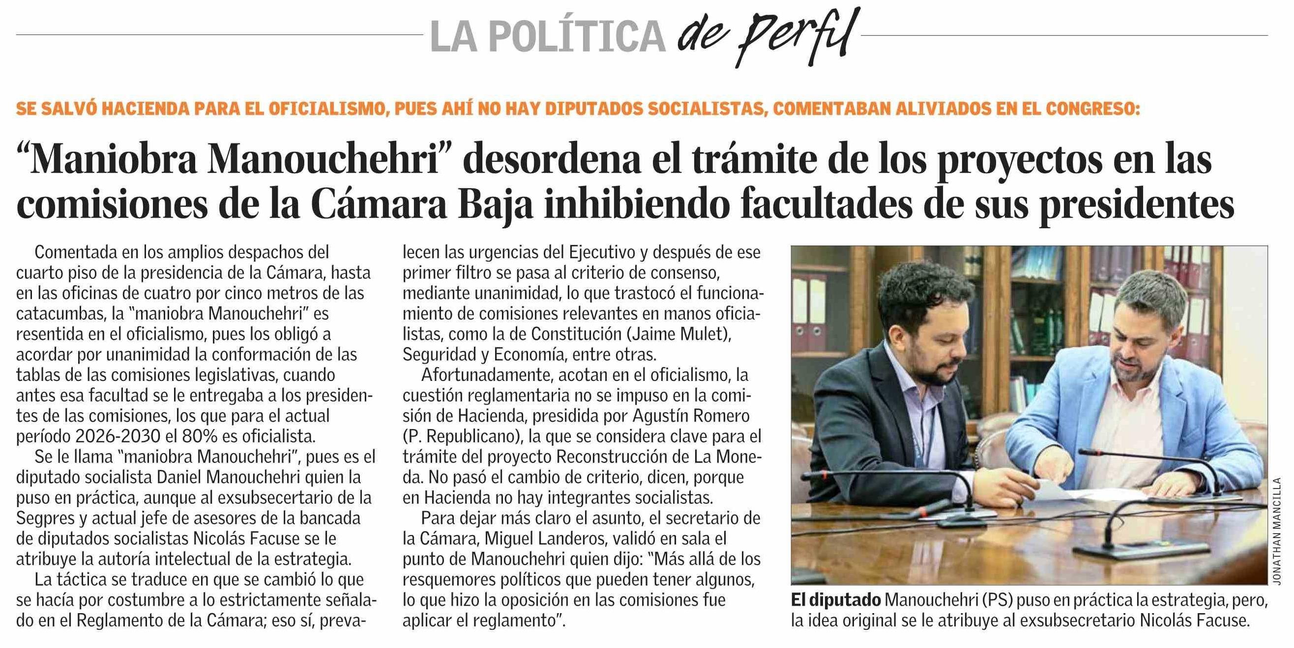 “Maniobra Manouchehri” desordena el trámite de los proyectos en las comisiones de la Cámara Baja inhibiendo facultades de sus presidentes 18-04-2026 El Mercurio |