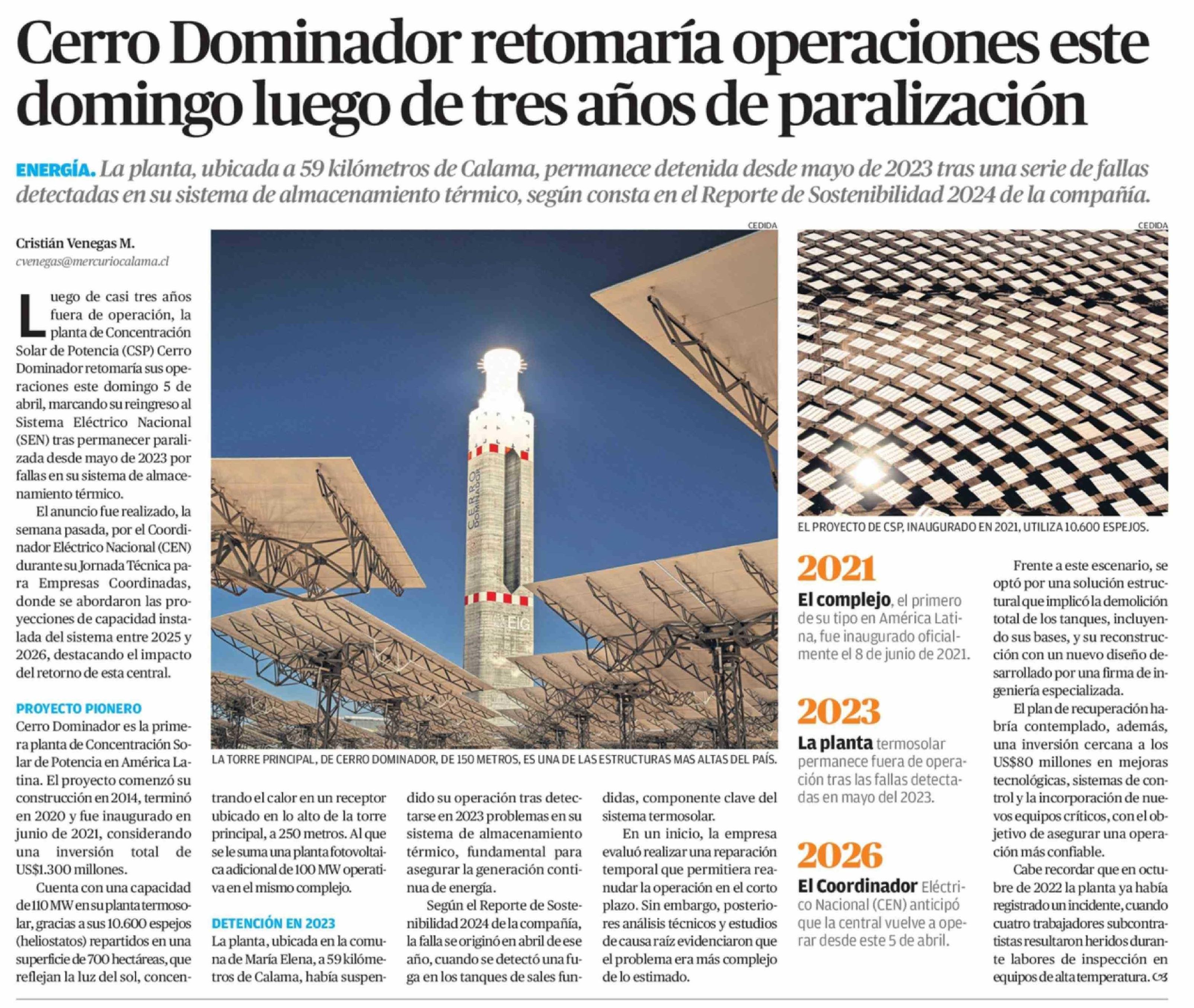 Cerro Dominador retomaría operaciones este domingo luego de tres años de paralización 02-04-2026 El Mercurio de Antofagasta |
