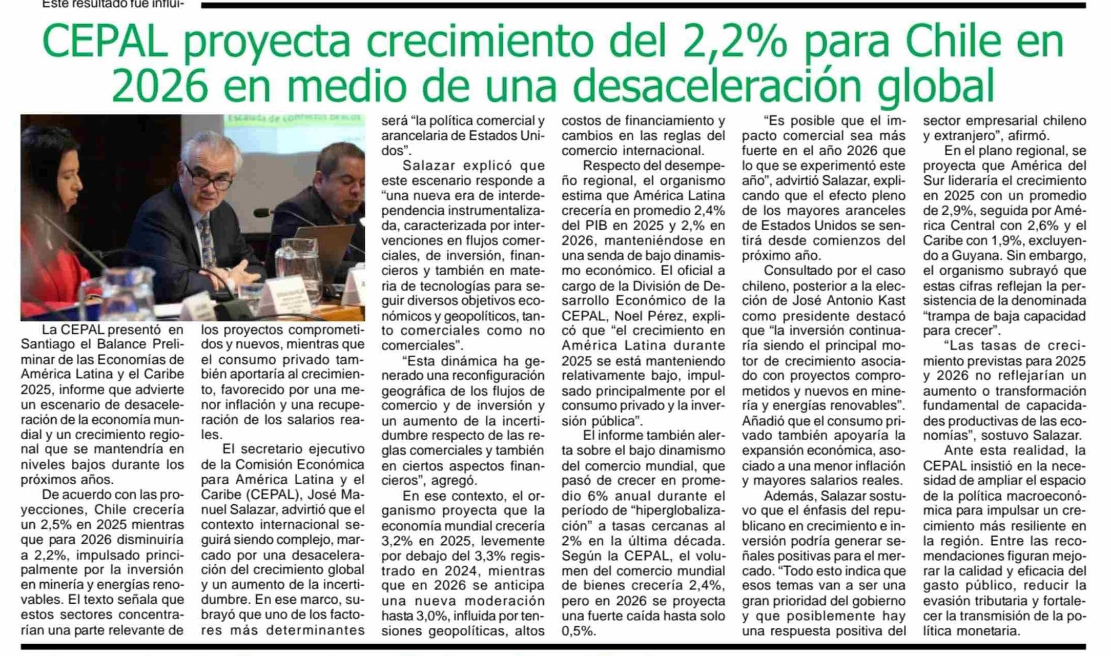 Título: CEPAL proyecta crecimiento del 2,2% para Chile en 2026 en medio de una desaceleración global