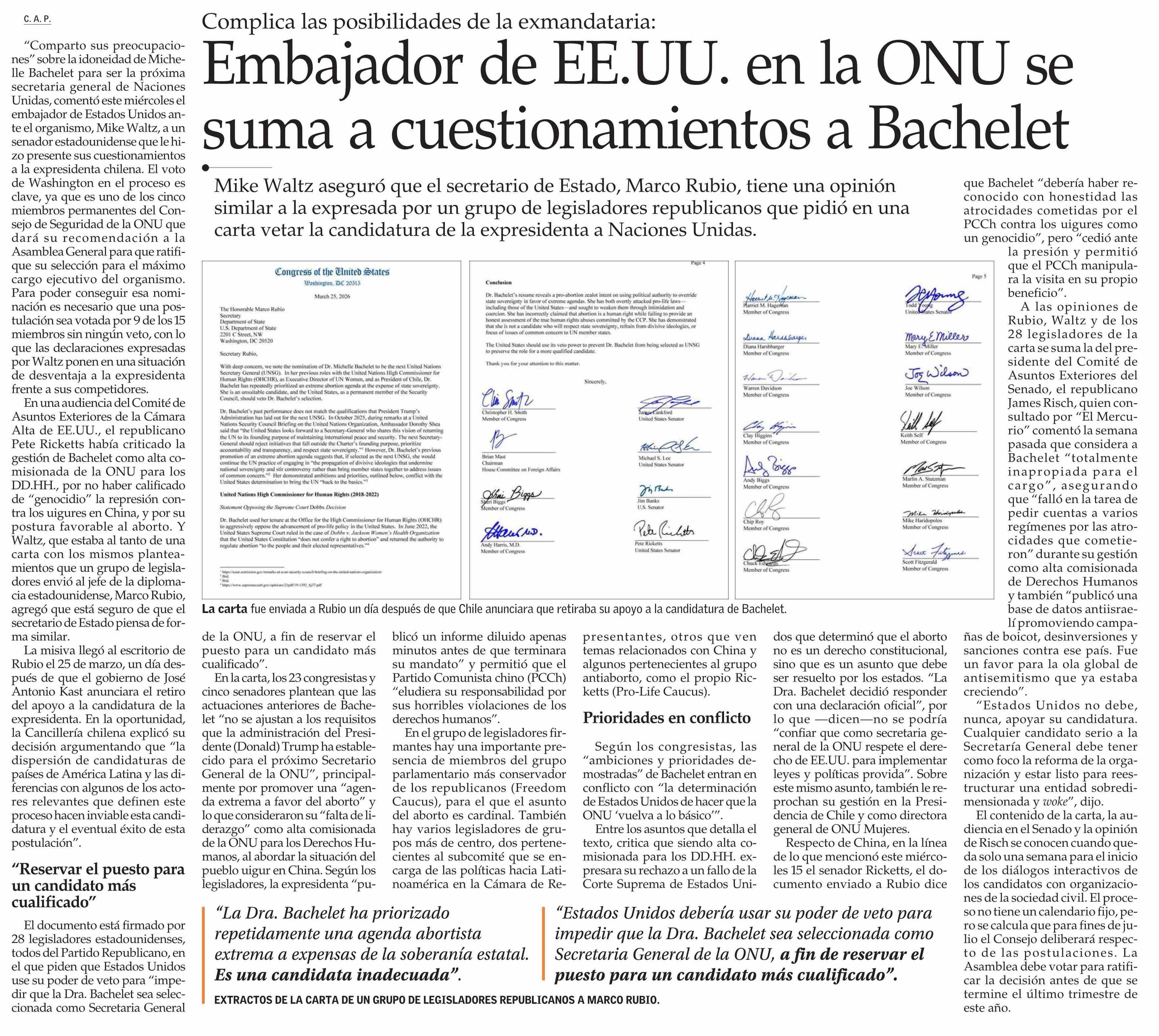 Embajador de EE.UU. en la ONU se suma a cuestionamientos a Bachelet 17-04-2026 El Mercurio |