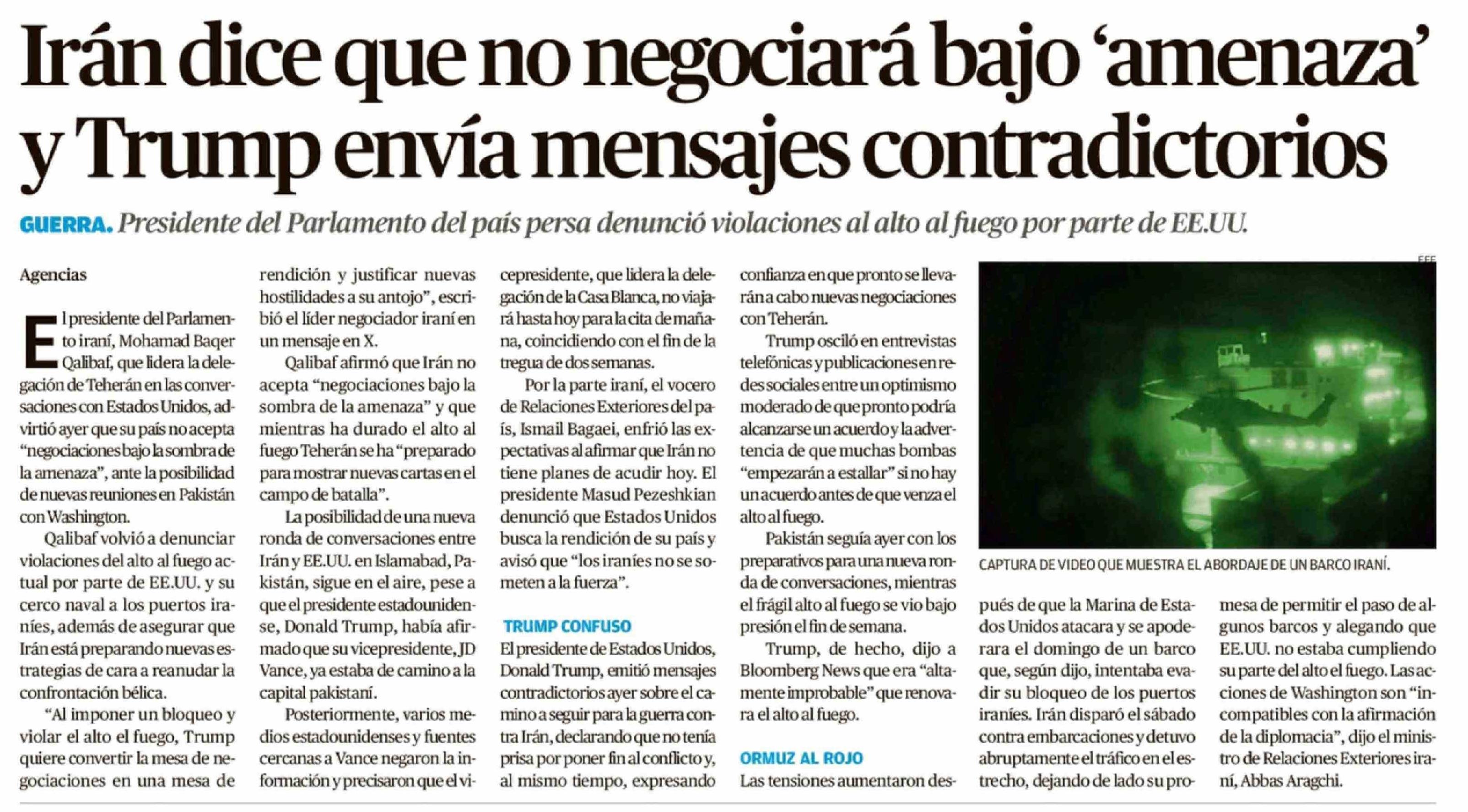 Irán dice que no negociará bajo 'amenaza' y Trump envía mensajes contradictorios 21-04-2026 Diario Austral Región de Los Ríos |
