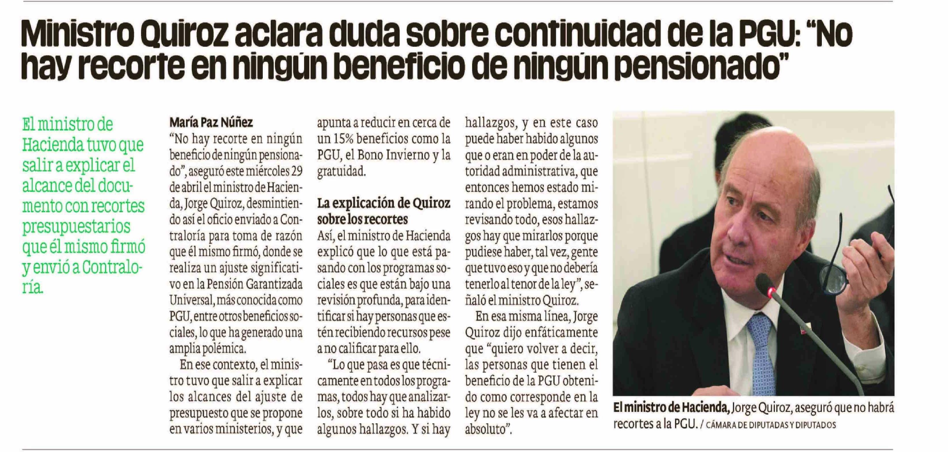 Ministro Quiroz aclara duda sobre continuidad de la PGU: "NO hay recorte en ningun beneficio de ningun pensionado" 30-04-2026 Publimetro |