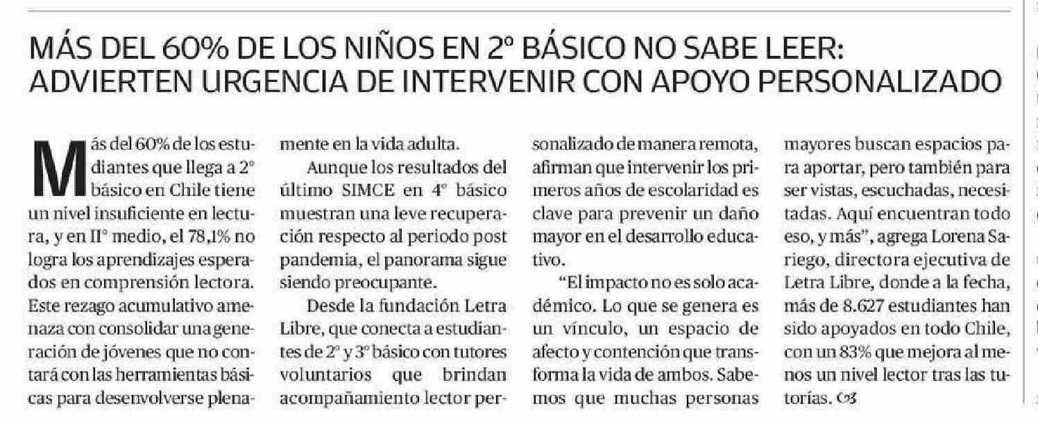 Título: MÁS DEL 60% DE LOS NIÑOS EN 2º BÁSICO NO SABE LEER: ADVIERTEN URGENCIA DE INTERVENIR CON APOYO PERSONALIZADO
