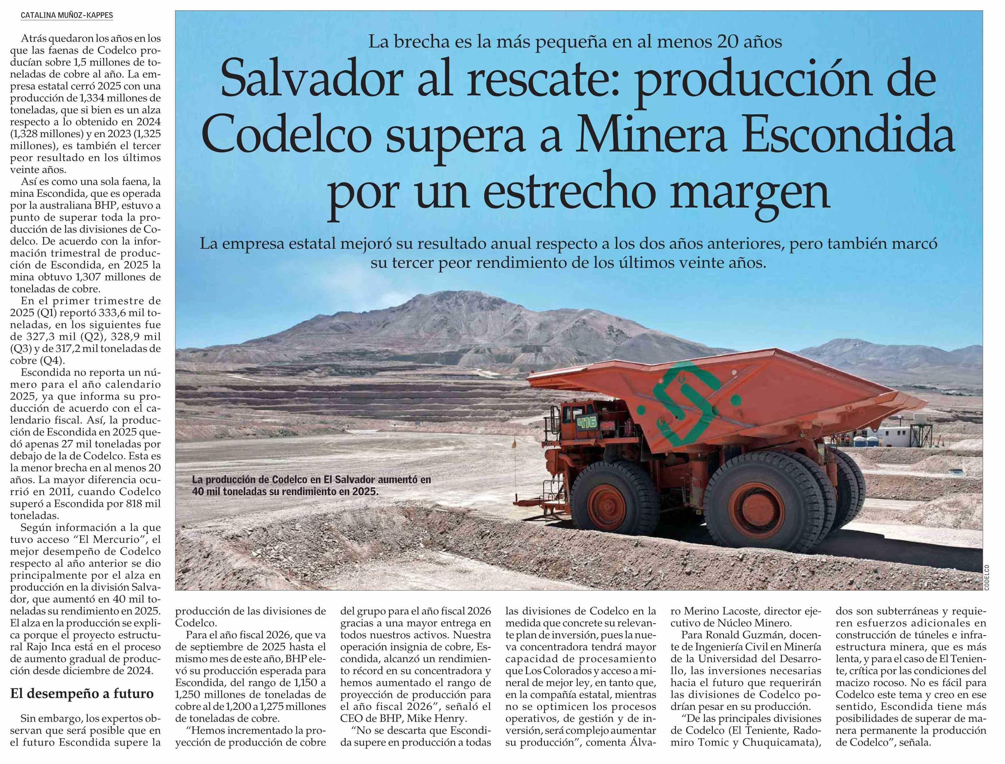 Salvador al rescate: producción de Codelco supera a Minera Escondida por un estrecho margen 26-01-2026 El Mercurio |