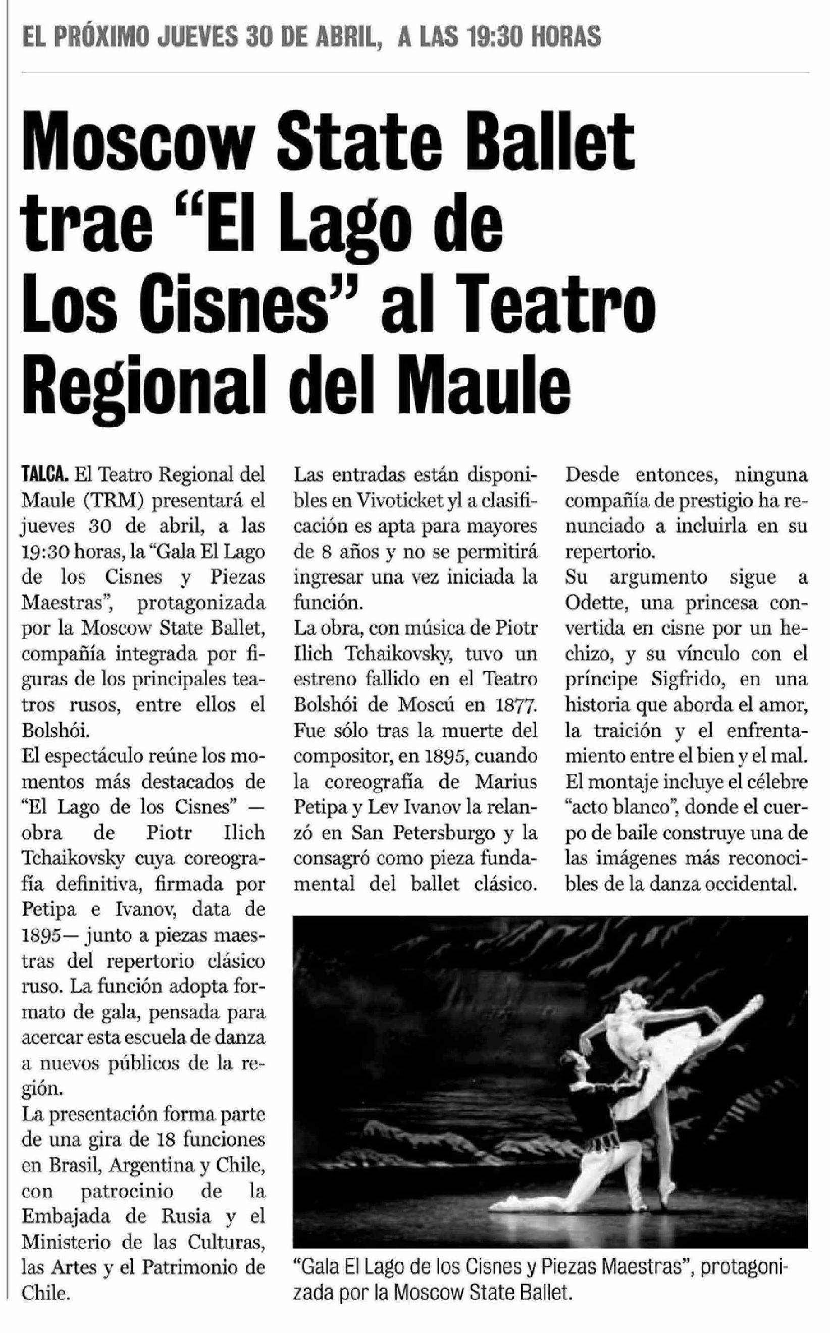 Moscow State Ballet trae "El Lago de Los Cisnes" al Teatro Regional del Maule 16-04-2026 La Prensa de Curicó |