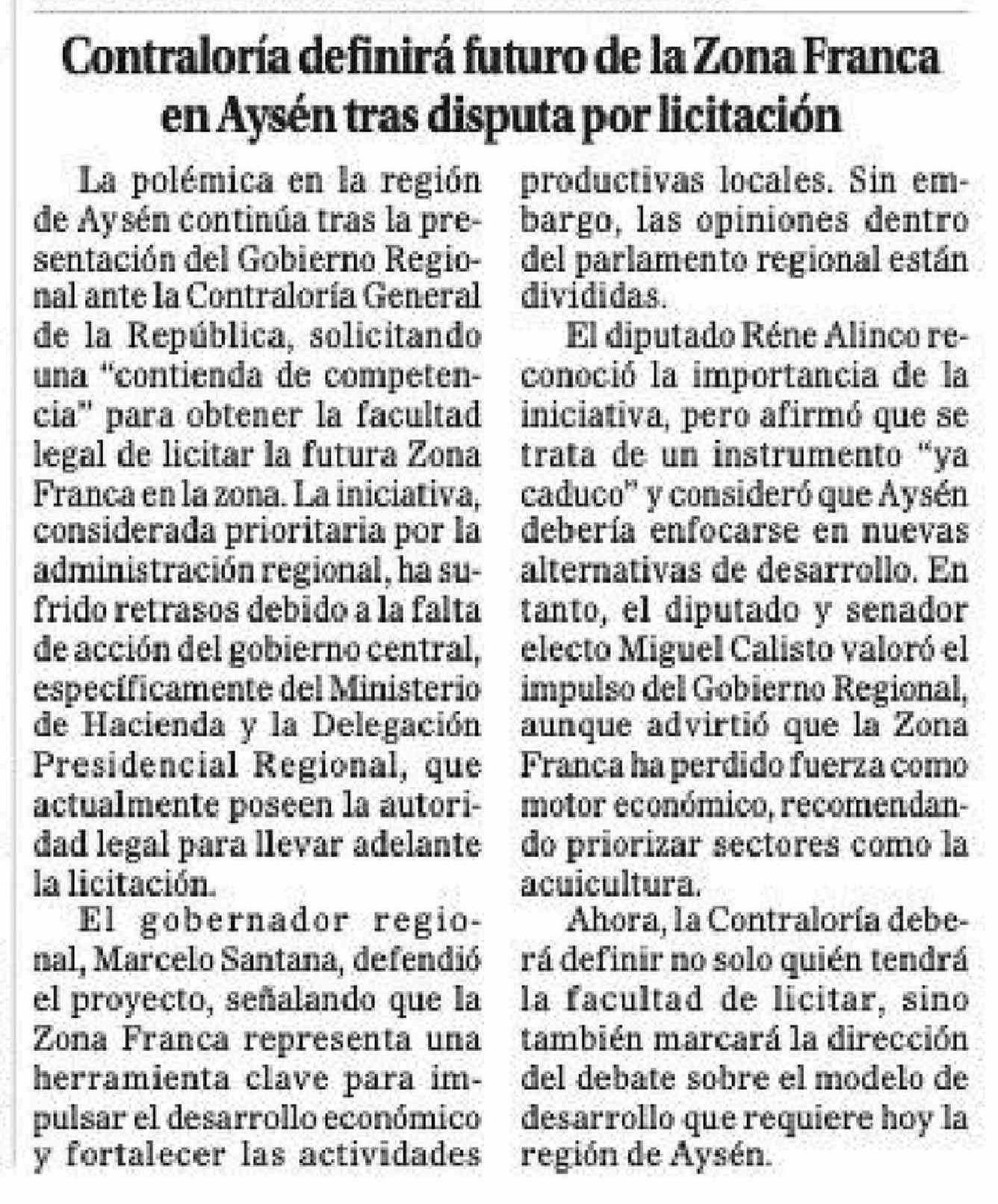 | Título: | Contraloría definirá futuro de la Zona Franca en Aysen tras disputa por licitación |