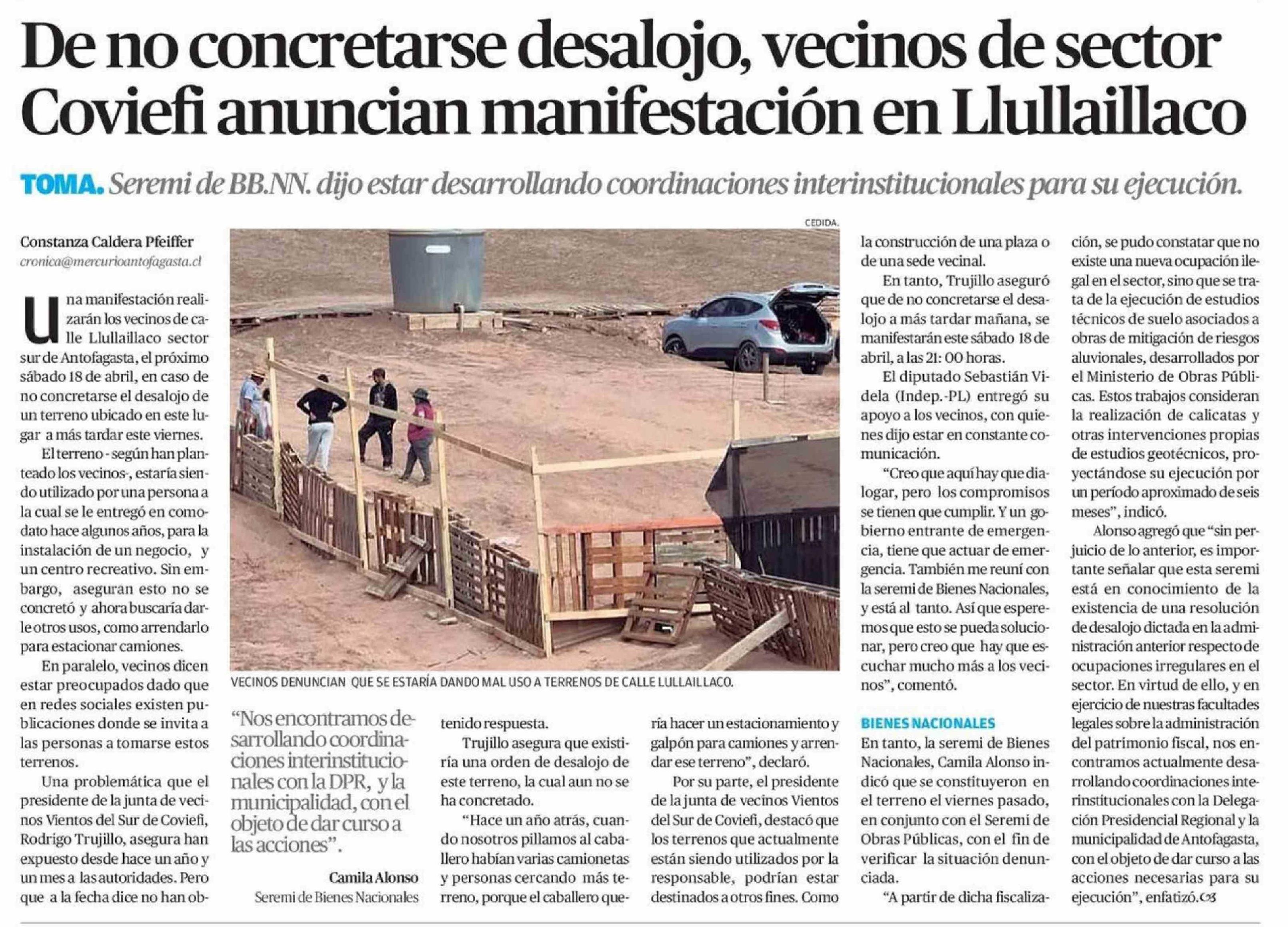 De no concretarse desalojo, vecinos de sector Coviefi anuncian manifestación en Llullaillaco 16-04-2026 El Mercurio de Antofagasta |