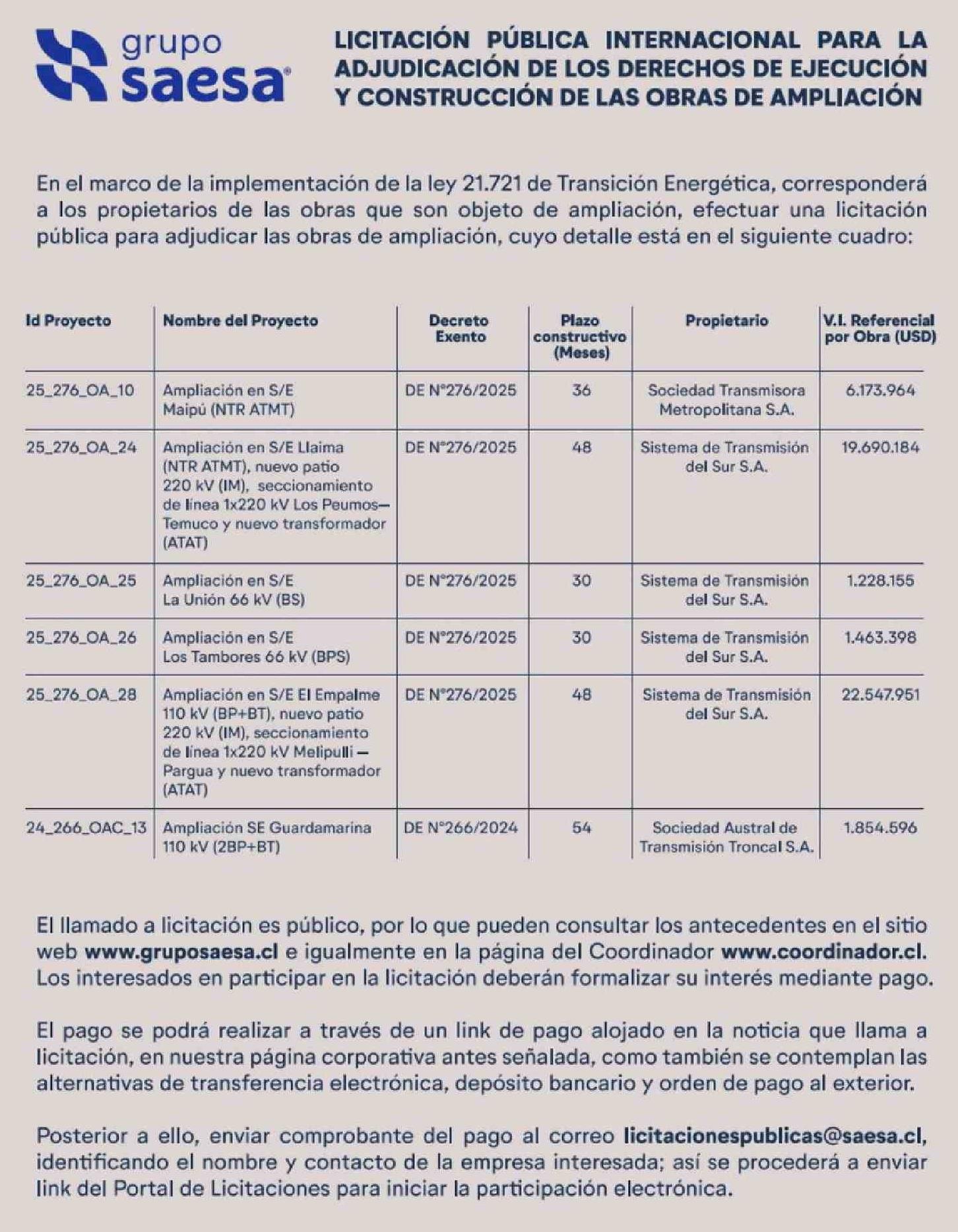 Título: Aviso Licitaciones: SAESA, LICITACIÓN PÚBLICA INTERNACIONAL PARA LA ADJUDICACIÓN DE LOS DERECHOS DE EJECUCIÓN Y CONSTRUCCIÓN DE LAS OBRAS DE AMPLIACIÓN