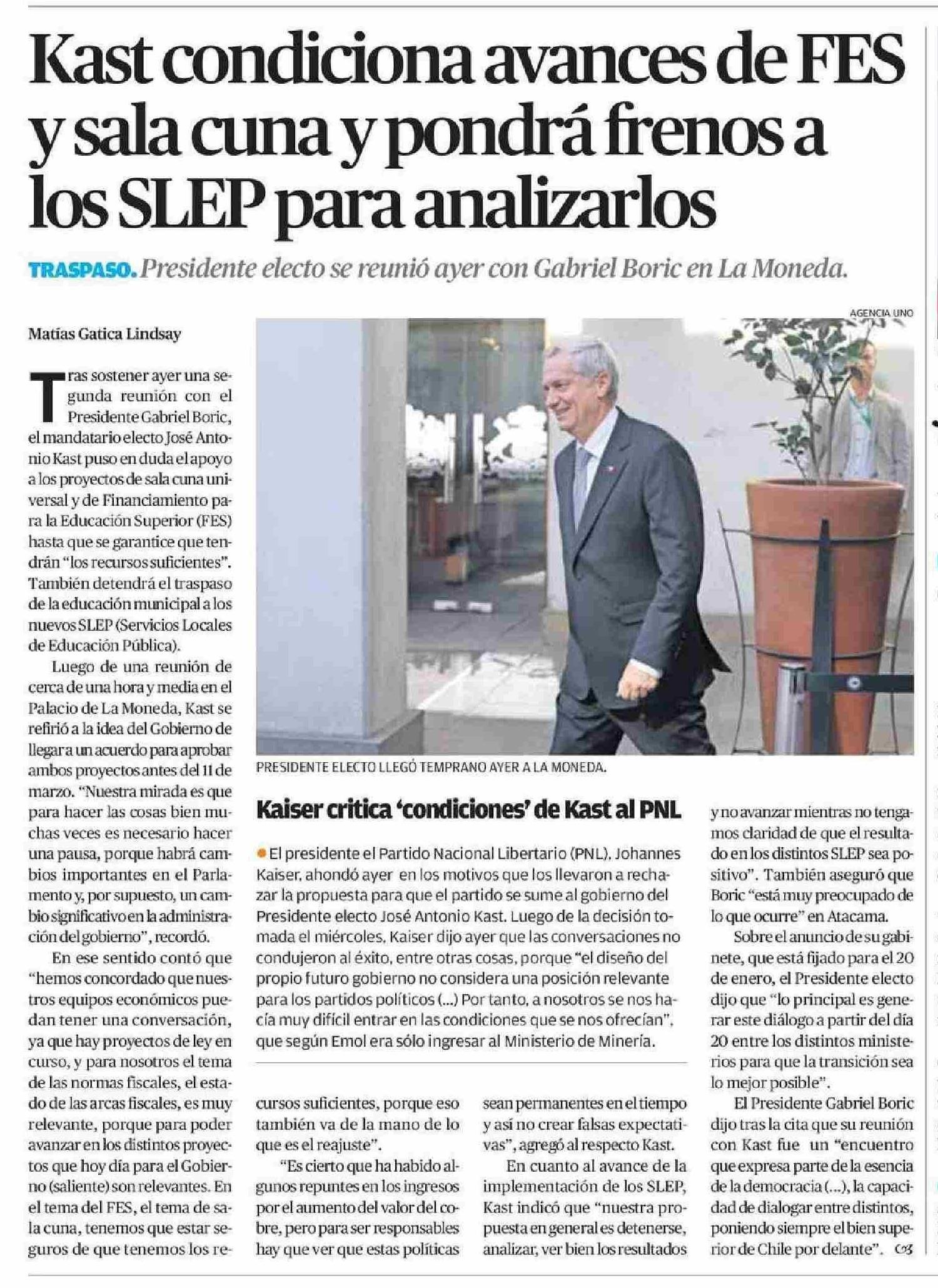 Título: Kast condiciona avances de FES y sala cuna y pondrá frenos a los SLEP para analizarlos